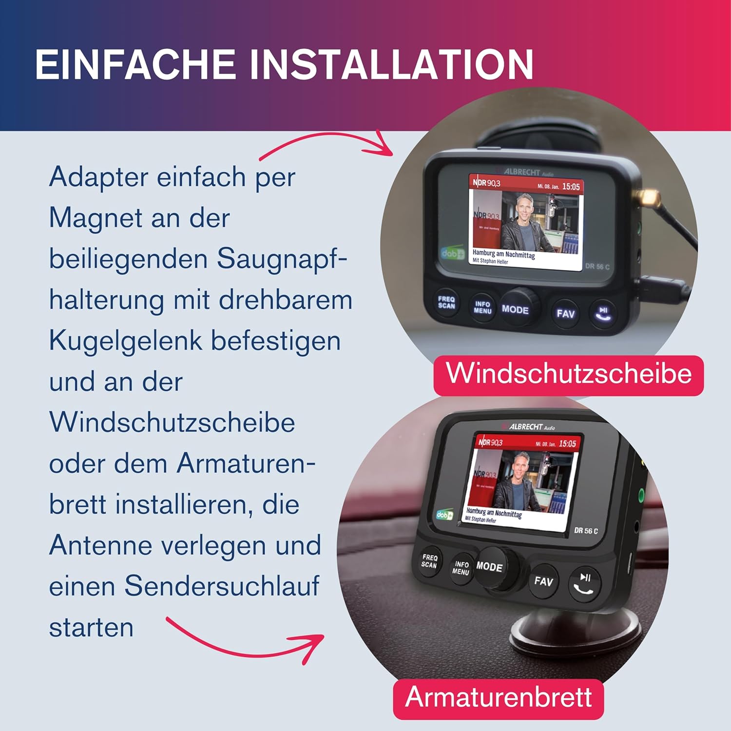 - Einfach praktisch: der DR56C Adapter wird mit einer Saugnapfhalterung und drehbarem Kugelgelenk befestigt. Die Freisprecheinrichtung ermöglicht Telefonate während der Fahrt, ideal für Pendler und im LKW.
