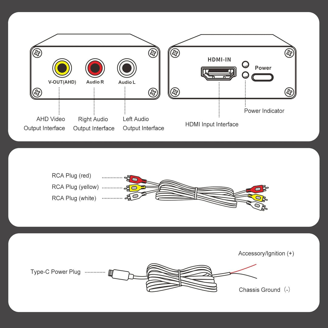 - 【Paketinhalt】 1 x HDMI-zu-AHD-Videokonverter; 1x Drei-in-Eins-RCA-Kabel; 1 x Zwei-in-Eins-Stromkabel; 1 x Benutzerhandbuch. Wenn Sie ein Problem haben, kontaktieren Sie uns und wir werden Ihnen innerhalb von 24 Stunden an Werktagen und innerhalb