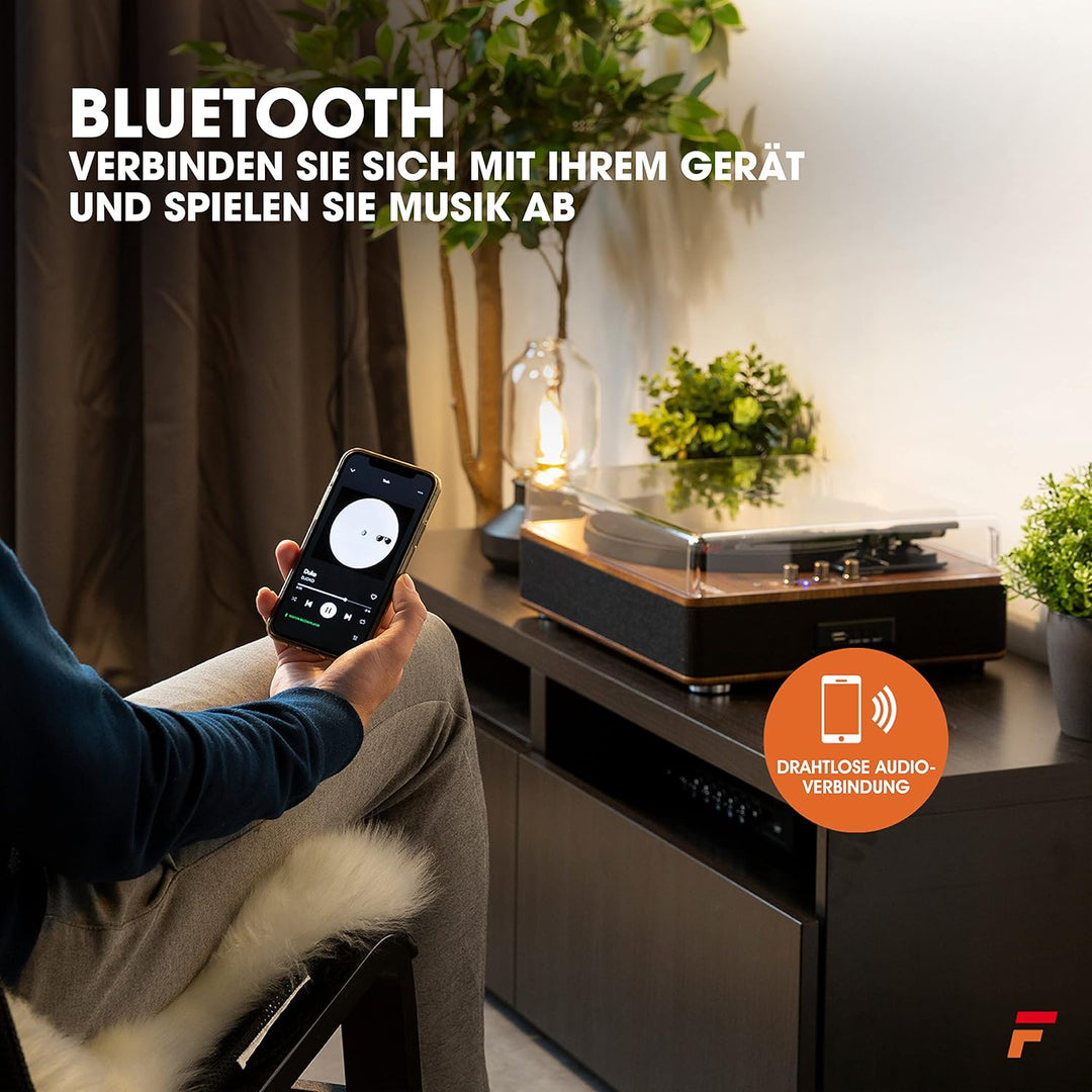 - USB Plattenspieler mit Bluetooth: Dank Bluetooth Ausgang können Sie Ihre Schallplatten auf ihre Kopfhörer übertragen, oder streamen Sie Ihre MP3-Musik von Ihrem Handy auf den Plattenspieler mit Boxen