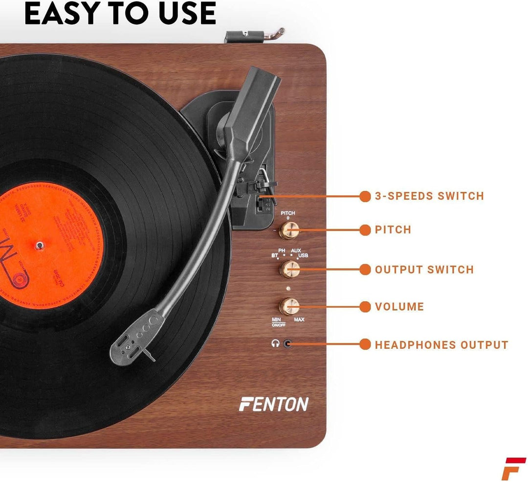 - RCA und Kopfhörer-Anschluss: Über den Cinch-Ausgang können Sie diesen Fenton Plattenspieler einfach an ein bestehendes Audiosystem anschliessen. Ausserdem gibt es eine Kopfhörerbuchse