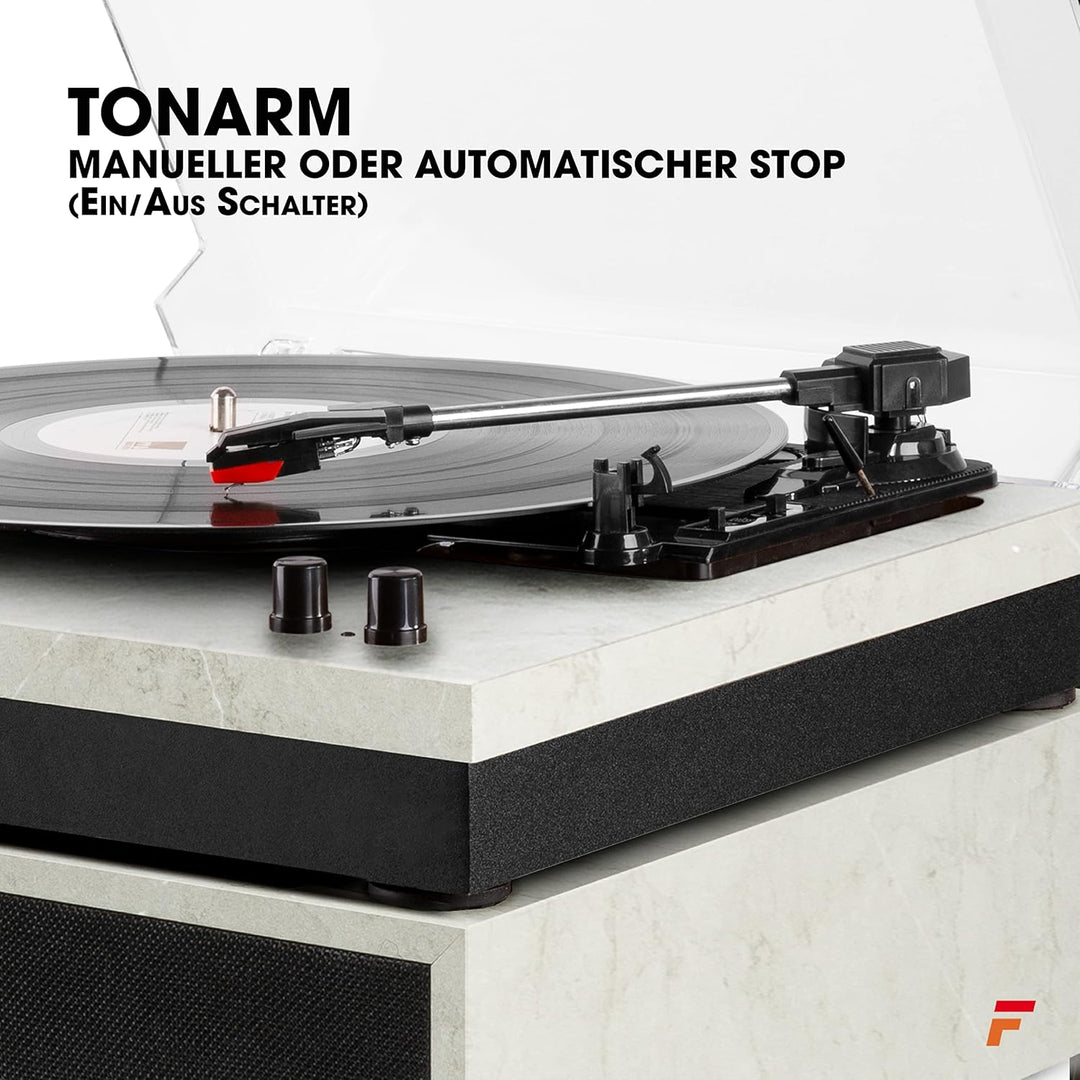 - Um zu verhindern, dass sich der Plattenspieler mit Boxen endlos dreht, gibt es eine automatische Stoppfunktion, die den Schallplattenspieler mit Lautsprecher am Ende einer Schallplatte anhält