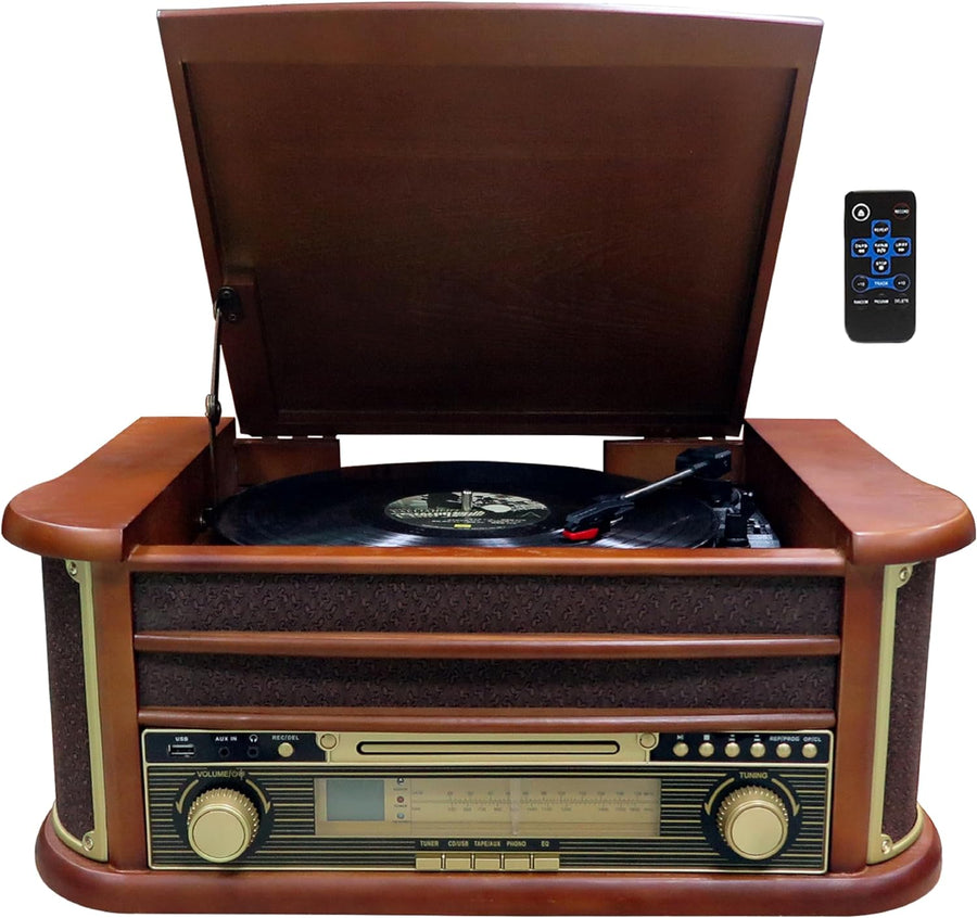 - ✔️ Highlights: Plattenspieler mit 3 Geschwindigkeiten (33/45/78) Hochwertiges Holz im Nostalgie Design Kassettendeck AUX IN CD MP3 Player USB Anschluss Bluetooth Aufnahme Funktion auf USB Stick Radio FM 88 -108MHz und Langwellen AM 530- 1600kHz