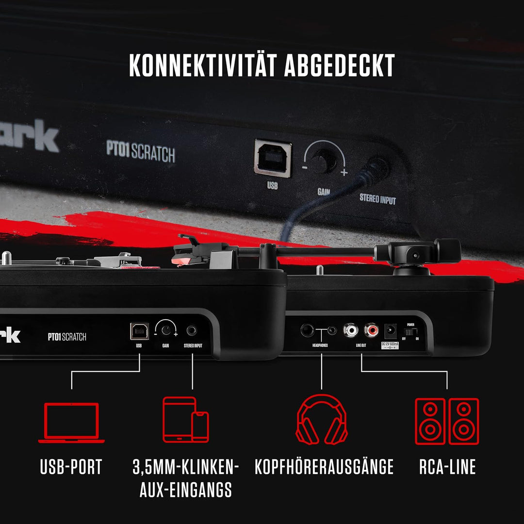 - Scratchen Sie zu Ihren Backing-Tracks dank des 3,5mm-Klinken-Aux-Eingangs mit einstellbarer Lautstärke oder nehmen Sie Ihre Performance mit dem integrierten USB-Interface stressfrei auf (Mac oder PC)