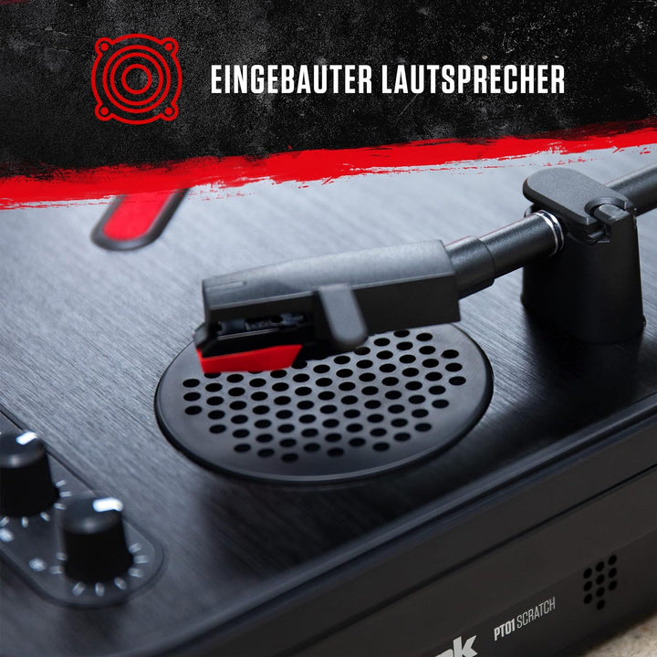 - Überall Scratchen dank des eingebauten Lautsprechers; alternativ können externe aktive Lautsprecher für mehr Power über die praktisch angebrachten Cinch-Ausgänge angeschlossen werden