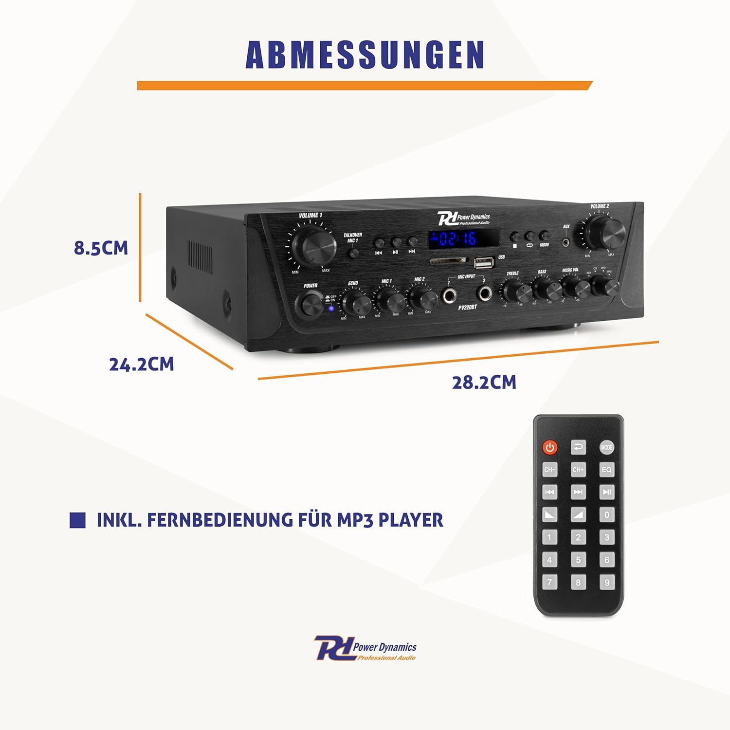 - DISPLAY MIT BELEUCHTUNG: Der PV220BT-Verstärker ist mit einem Display ausgestattet, auf dem beispielsweise bei Verwendung des MP3-Players die dazugehörigen Informationen angezeigt werden.