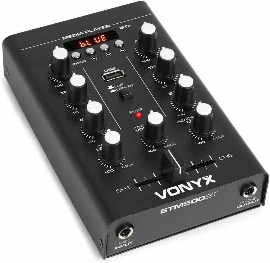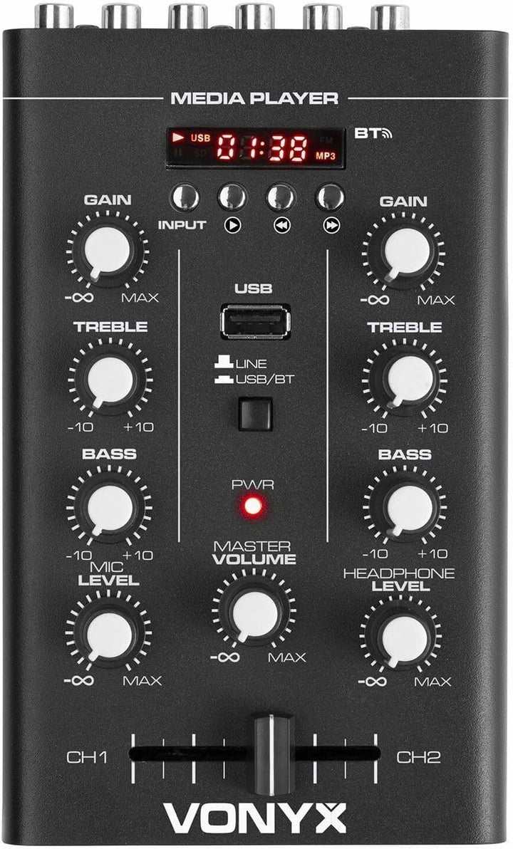 - Der Vonyx STM500BT ist ein kompakter 2-Kanal-Mischer. Es ist möglich, zwei Audioquellen über RCA an den Mischer anzuschliessen. Der eingebaute mp3-Player ermöglicht es, mp3-Musik direkt von einem USB-Stick abzuspielen.