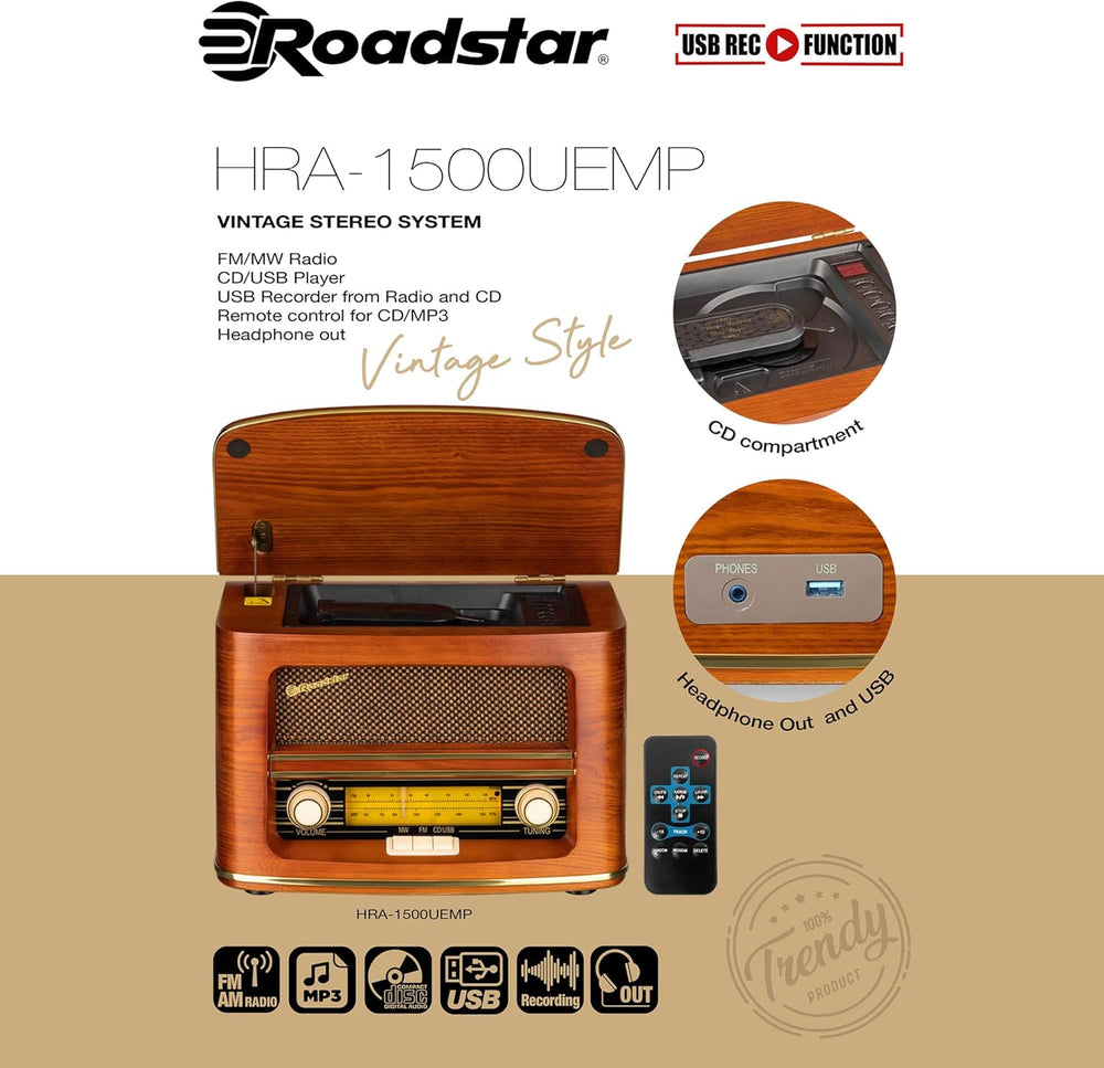 Roadstar HRA-1500UEMP Tragbares CD-Radio Vintage FM/MW, CD-MP3-Player, USB Aufnahmefunktion, Stereo,