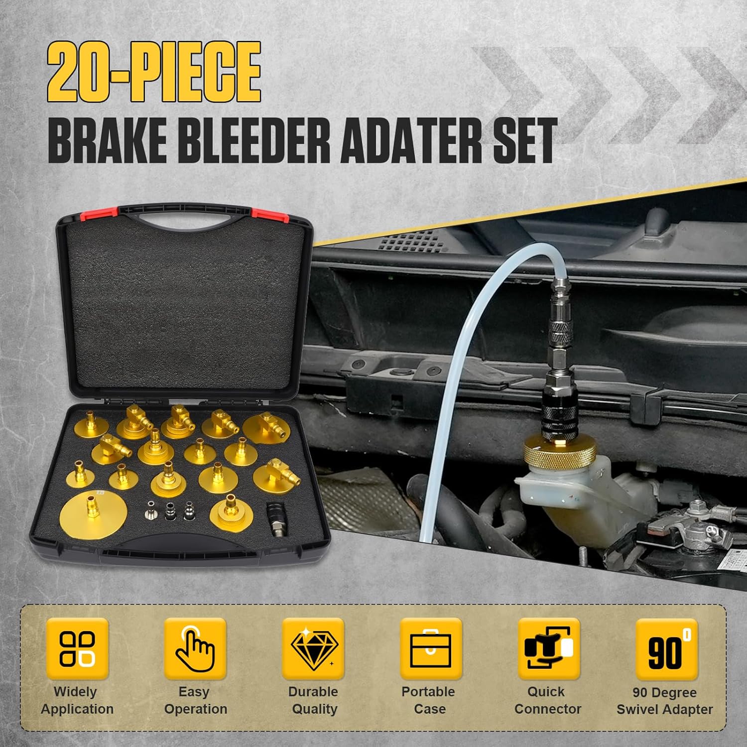 - [20-tlg Bremsenentlüftungsadapter] Das Bremsflüssigkeits-Entlüftungsadapter-Kit enthält 16 tlg Hauptbremszylinderadapter und 4 Kupplungen. Die standardmässige 90-Grad-Schlauchkupplung passt für die meisten Bremsentlüfter. 4 Kupplungen ermöglichen