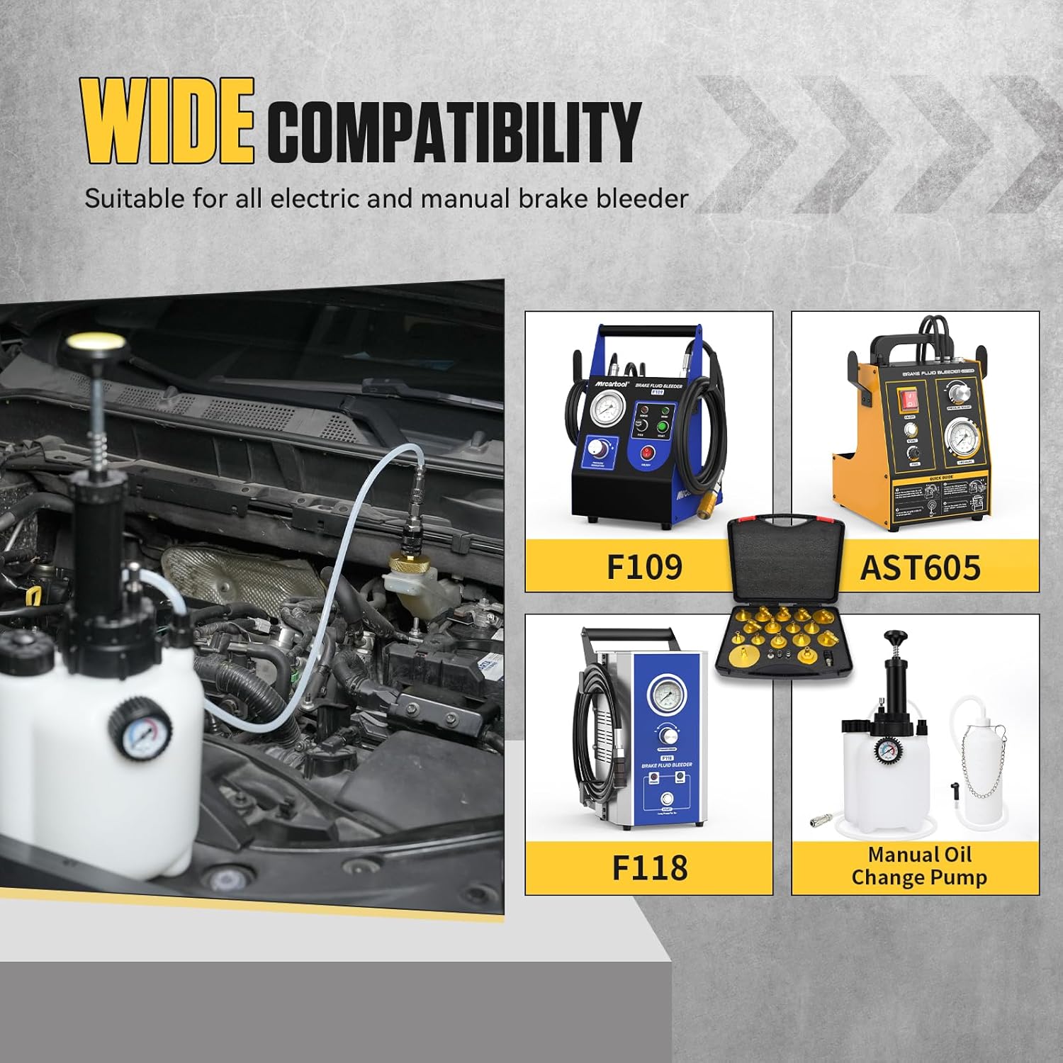 - [Passend für Alle Bremsflüssigkeitswechselgeräte] Der Bremsflüssigkeitszylinder-Adapter-Satz kann von Automobil-Bremsflüssigkeitsentlüfter begleitet werden. Es kann kompatibel mit MR CARTOOL F118 ,F109und kompatibel mit AUTOOL AST609, AST605