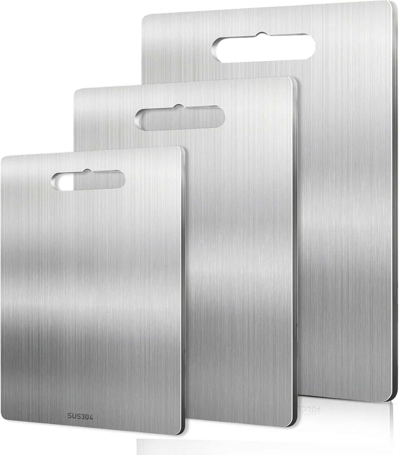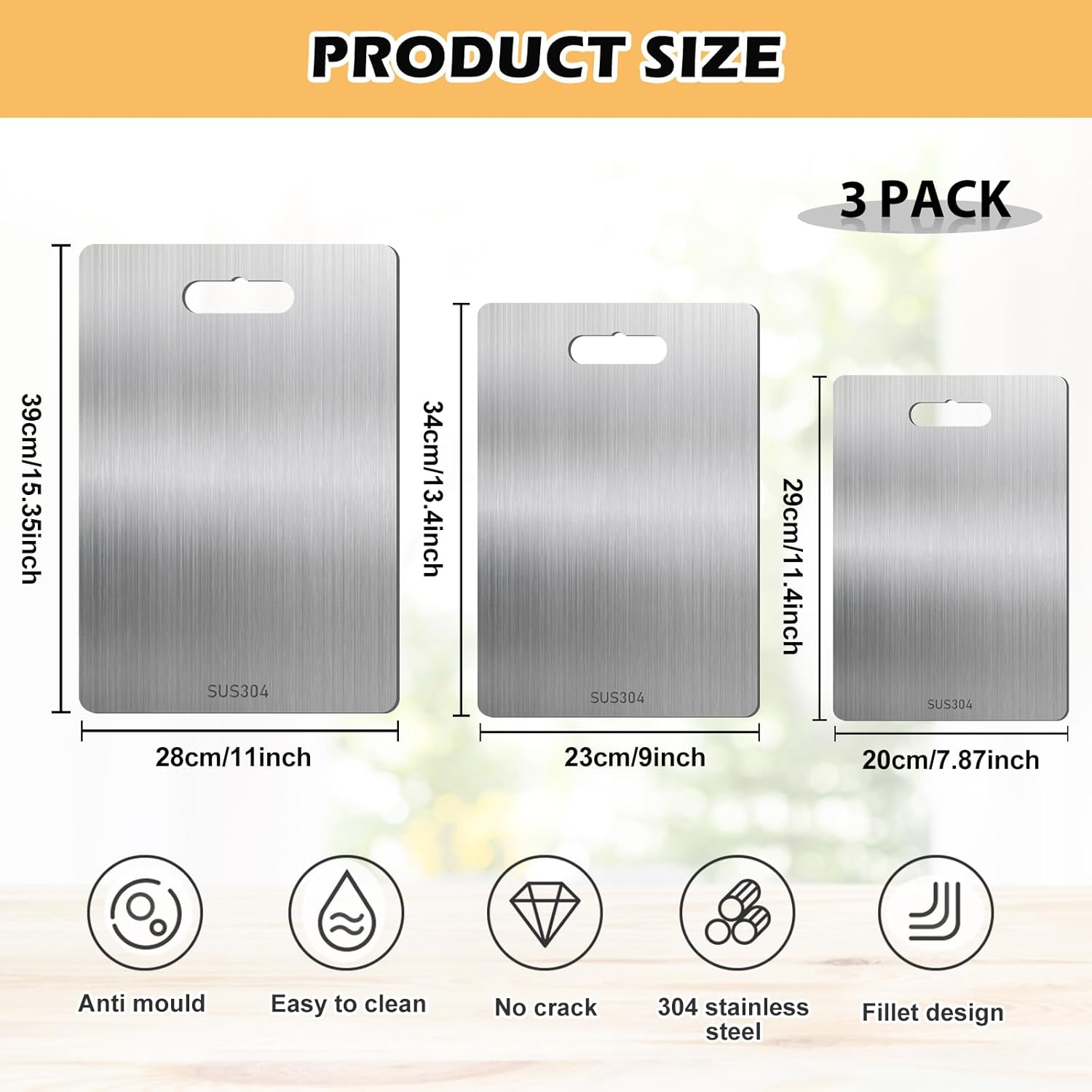 - Schneidebrettgrösse:Wir enthalten 3 Schneidebrett aus Edelstahl in verschiedenen Grössen, die kleine Grösse beträgt 29 x 20 cm, die mittlere Grösse beträgt 39 x 28 cm und die grosse Grösse beträgt 34 x 23 cm. Es kann auf beiden Seiten