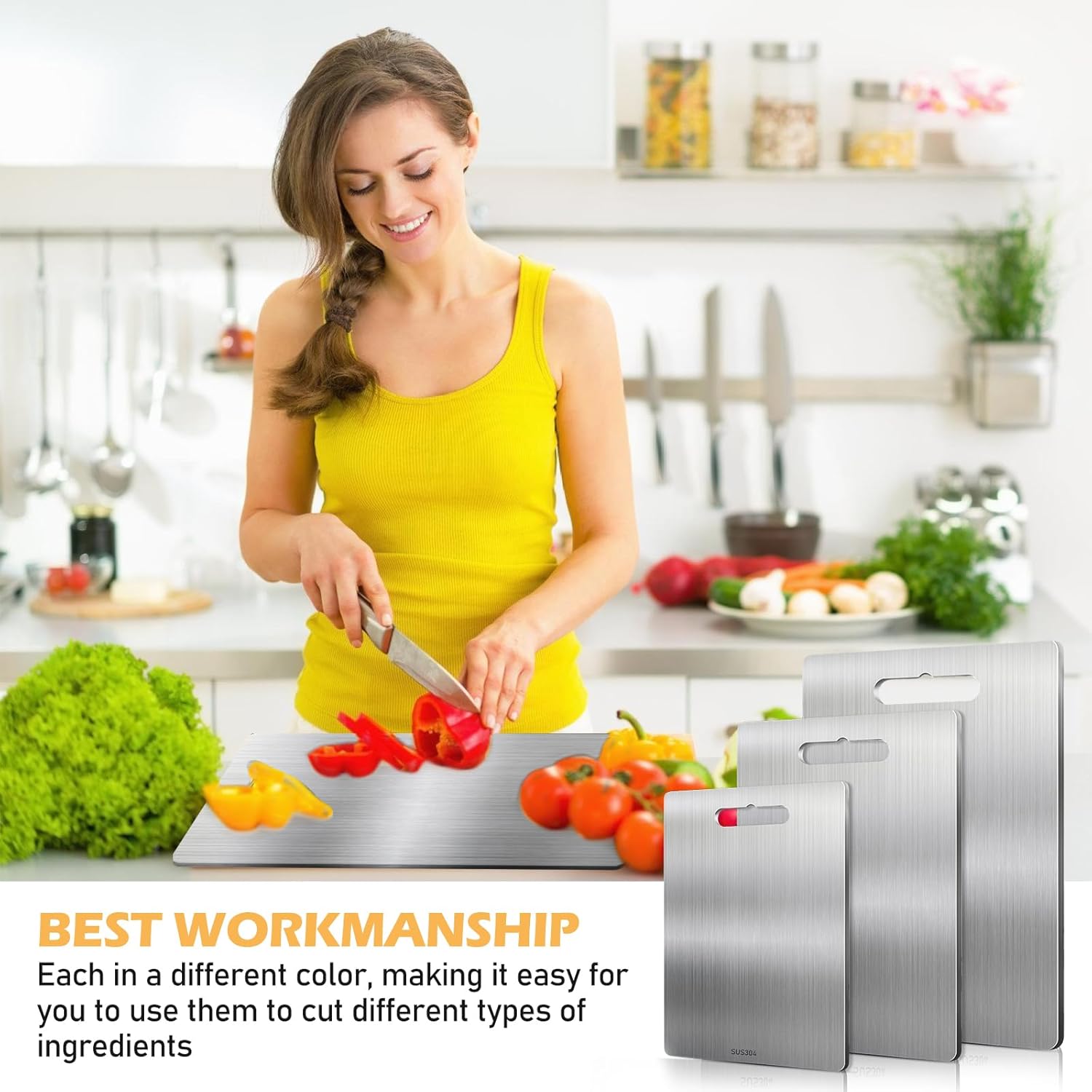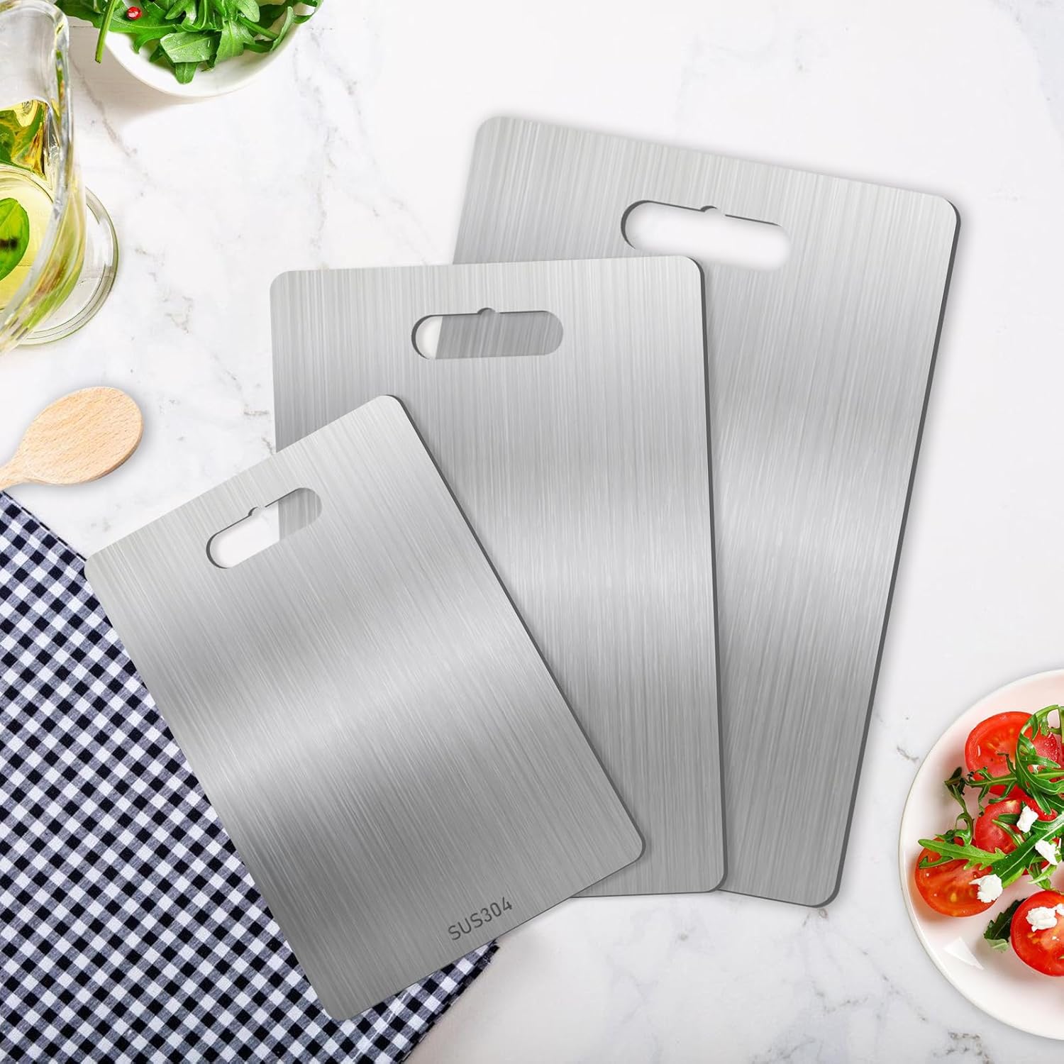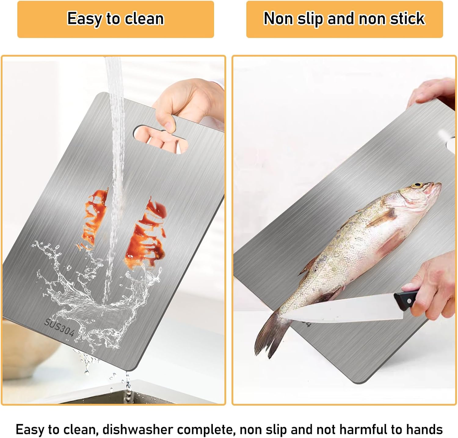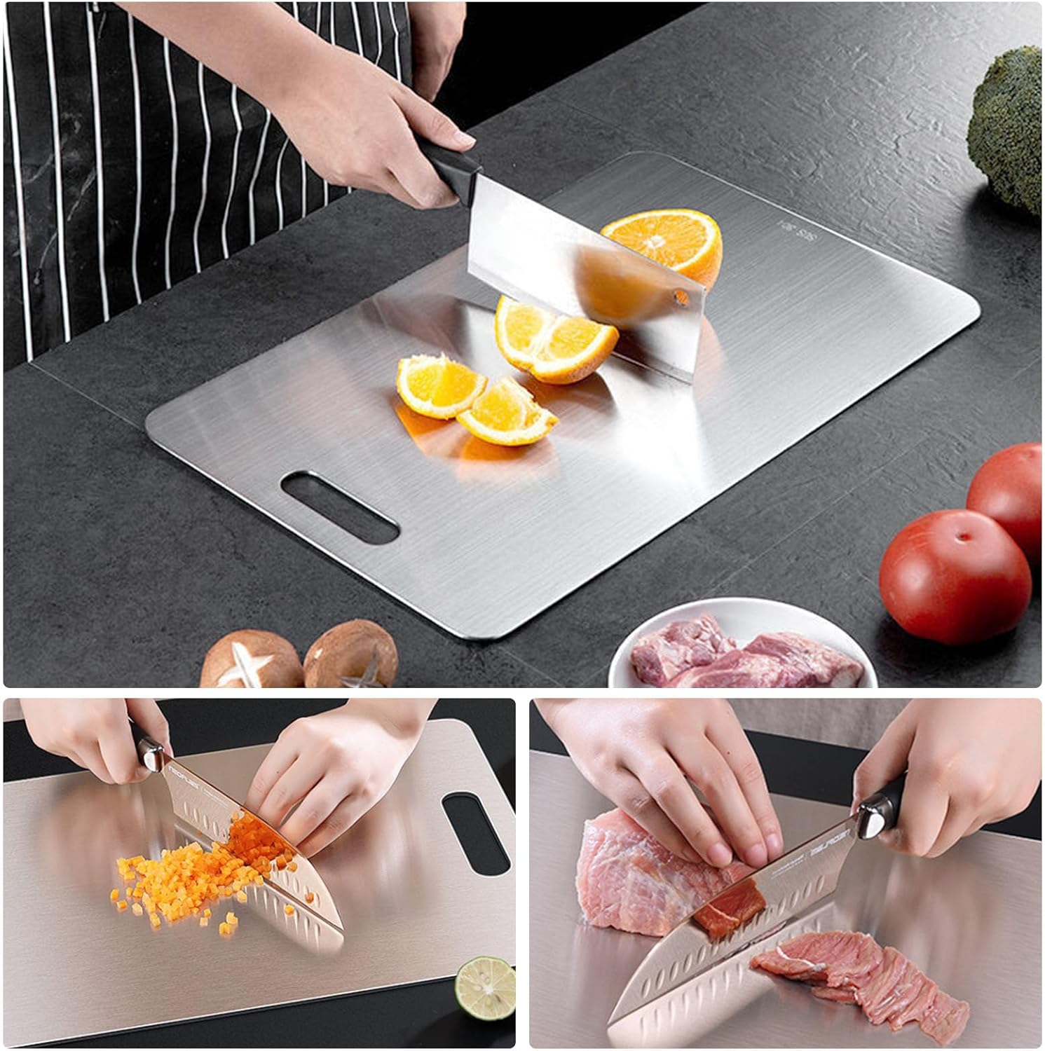 - Mehrere Grössen:Schneidebrett aus Edelstahl ist in verschiedenen Grössen erhältlich, um Ihren unterschiedlichen Kochanforderungen gerecht zu werden. Geniessen Sie saubere Arbeitsplatten und eine elegante Atmosphäre in Ihrem Kochbereich.