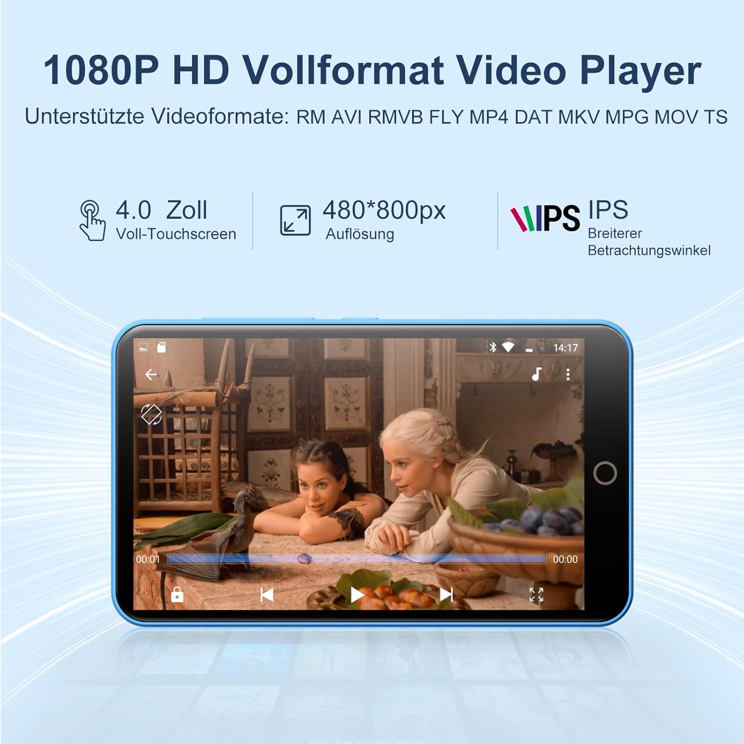 - 【4.0 Zoll 1080P IPS Touchscreen Mp3 Player】Unser Streaming-MP4-Player verfügt über ein 4 Zoll 1080P HD-Vollbild-Touch-Display, mit dem Sie das audiovisuelle Filmerlebnis geniessen können. Das Android-System sorgt für einen reibungslosen,
