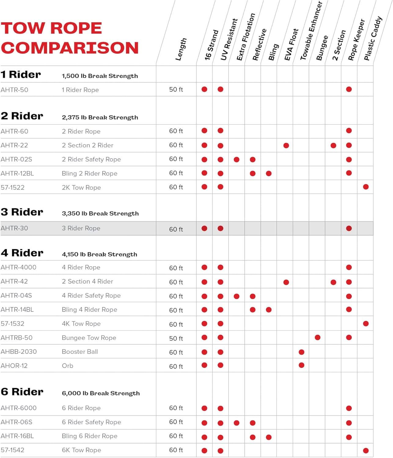 - Das Airhead AHTR-30 Abschleppseil hat eine Zugfestigkeit von 1,5 kg und ist geeignet für 1-3 Personen Schlepprohre