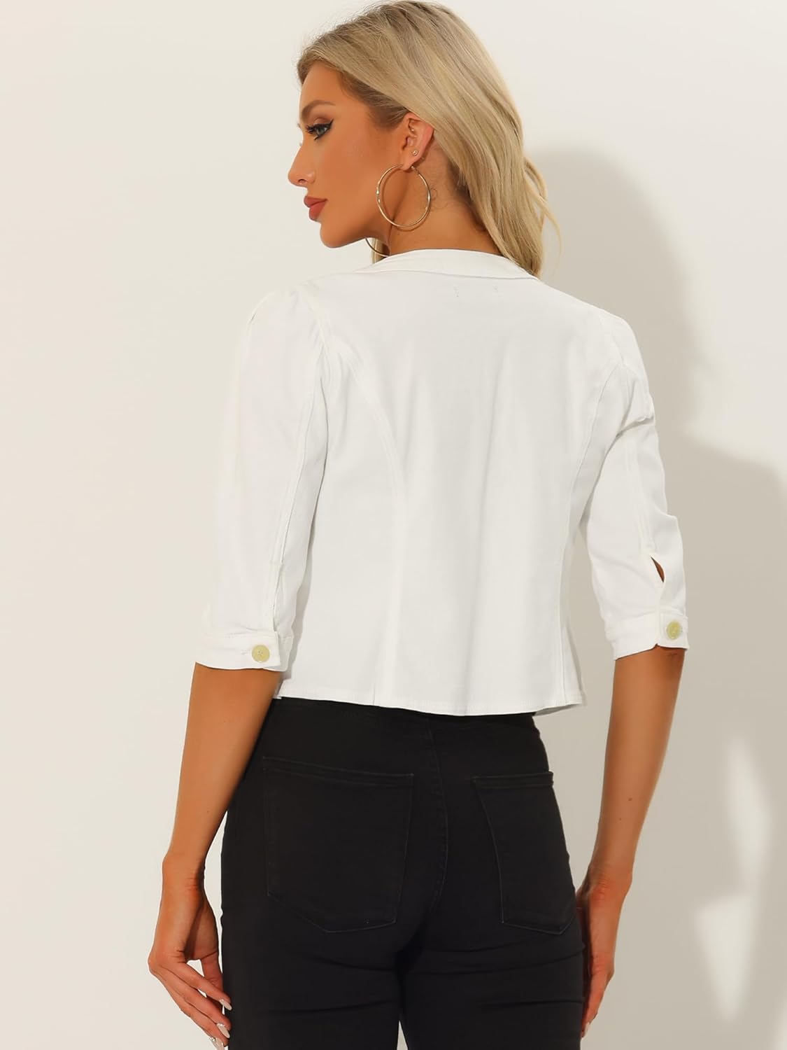 - Femininer Stil, Rundhalsausschnitt, 3/4-Ärmel, vorne offen, kurze Länge, Freizeitjacke
