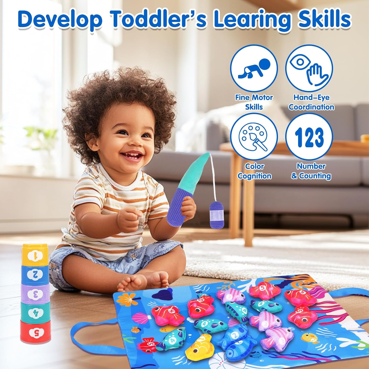 - Montessori-Angelspiel-Set: Das Set enthält eine Angelrute, 15 Stofffische, 5 stapelbare Fischeimer und eine Spielmatte, die gleichzeitig als Aufbewahrungstasche dient. Als Babyspielzeug für 12-18 Monate weckt es die Neugier der Kinder, fördert ihre