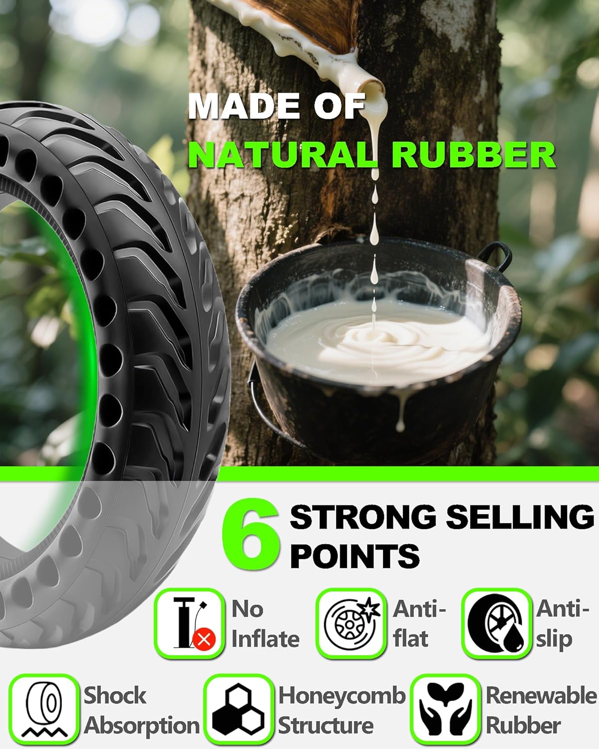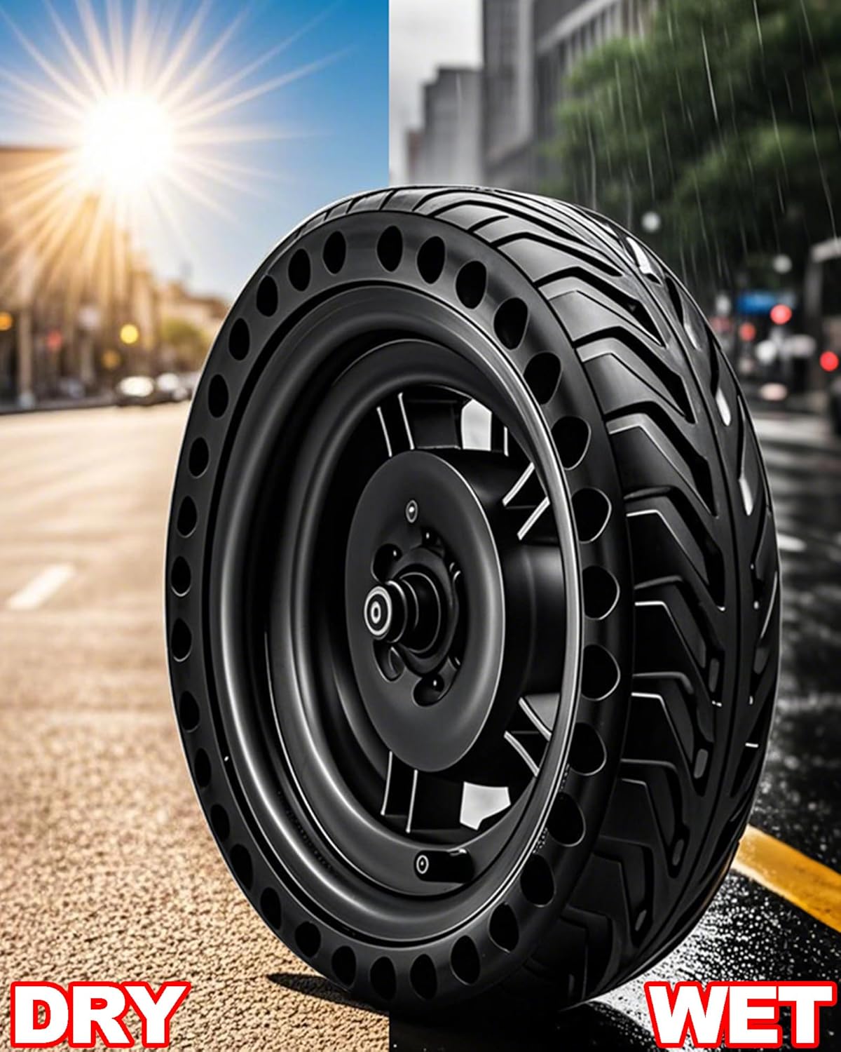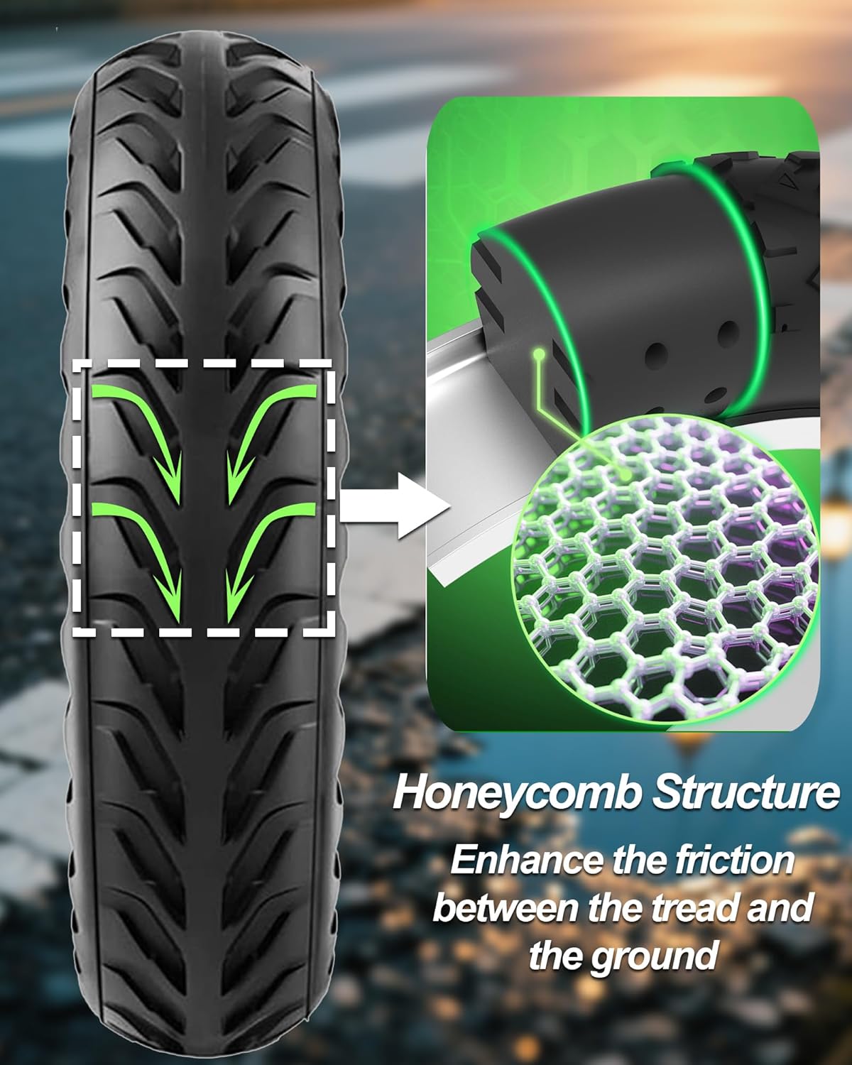 - Schockabsorbierung: Die präzisionsgefertigte 50/75-6.1 Wabenstruktur absorbiert Pannen, indem sie Stösse über mehr als 120 sechseckige Zellen verteilt, während das schlauchlose Design den Reifen ohne Luft fest an der Nabe hält