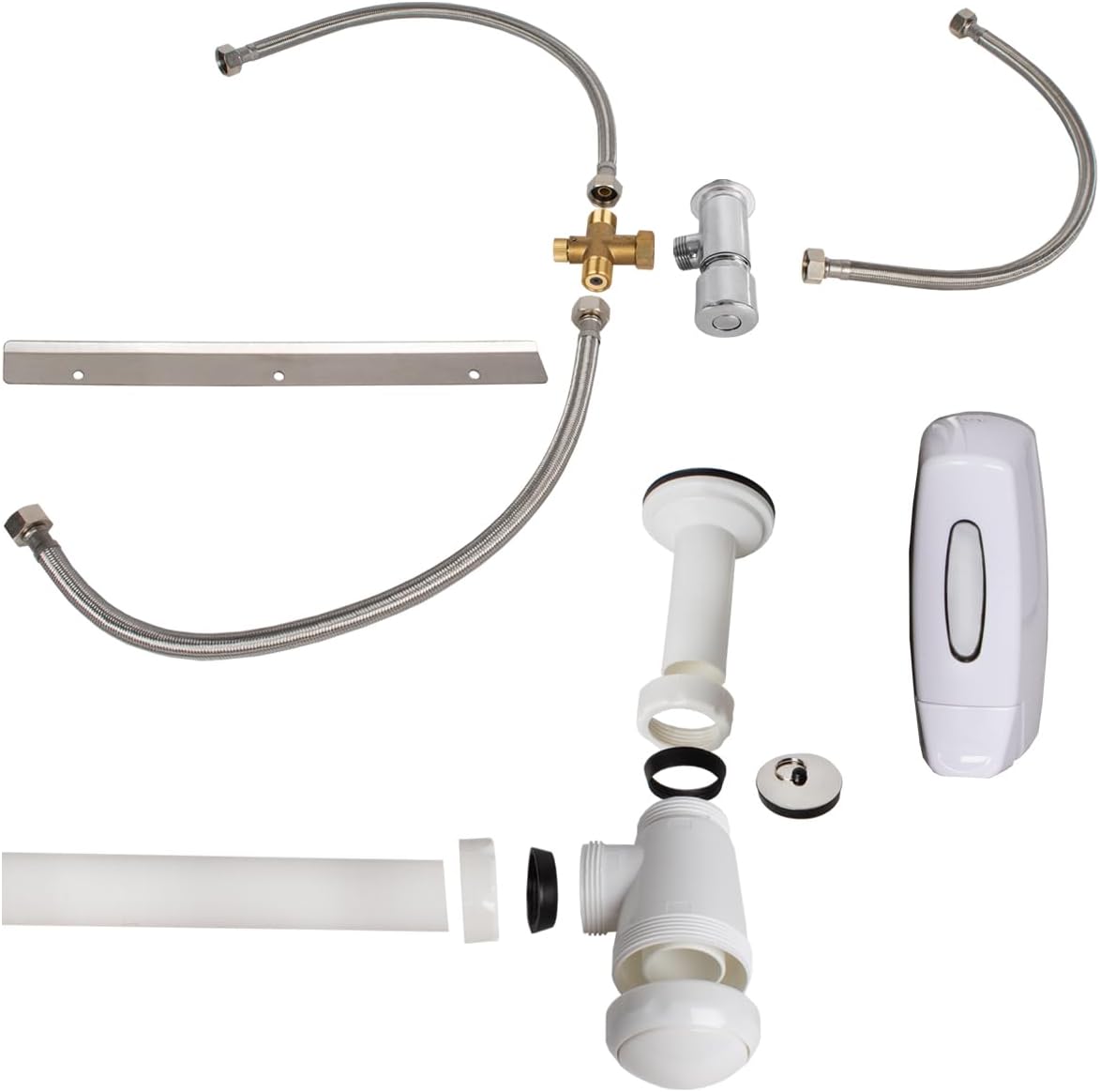 - Lieferumfang: 1x Waschbecken, 1x Wasserhahn, 1x Seifenspender, 1x Wandhalterung, 3x Flexschlauch, 1x Stöpsel fürs Becken, 1x Befestigungsmaterial, 1x Betätigungsknopf, 1x Ablauf / Abfluss, 1x Siphon