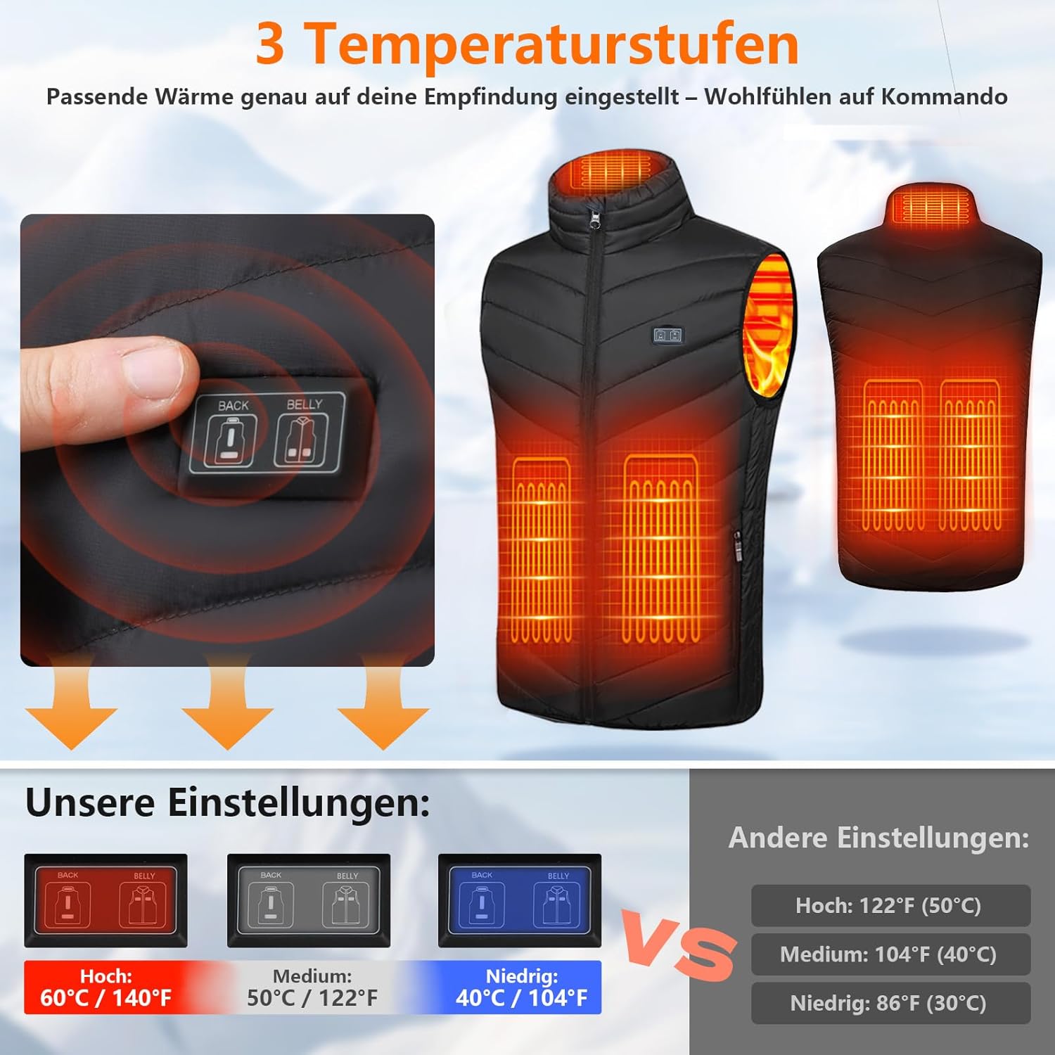 - 【Intelligente 3 Temperatureinstellungen】Schnelles Aufheizen, nur 5-10 Sekunden, beheizbare weste kann Ihnen durch das intelligente Heizsystem, intelligent dreistufig einstellbar (hoch, mittel, niedrig), genügend Wärme liefern. Rot hohe Temperatur