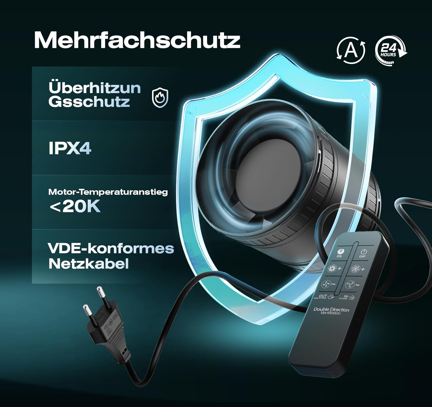 - Mehrfachschutz für Sicheren Einsatz: Der inline ventilator mit Überhitzungsschutz – die Temperatur des bürstenlosen DC-Motors bleibt unter 20K für langfristig sicheren Betrieb. Rohrventilator regelbar ausgestattet mit 1,5m Netzkabel und Stecker
