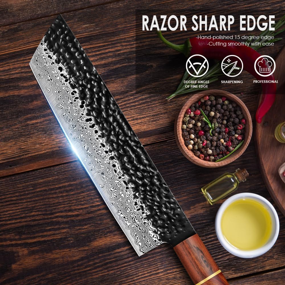 - 【RASIERMESSER-SCHARF】Dank Damaststahl wird ein Klingenhärtegrad von 60±2 HRC erreicht. Das Profi-Hackmesser ist und bleibt extra scharf. Der Hammerschlag verleiht der Klinge eine ganz besondere Optik.