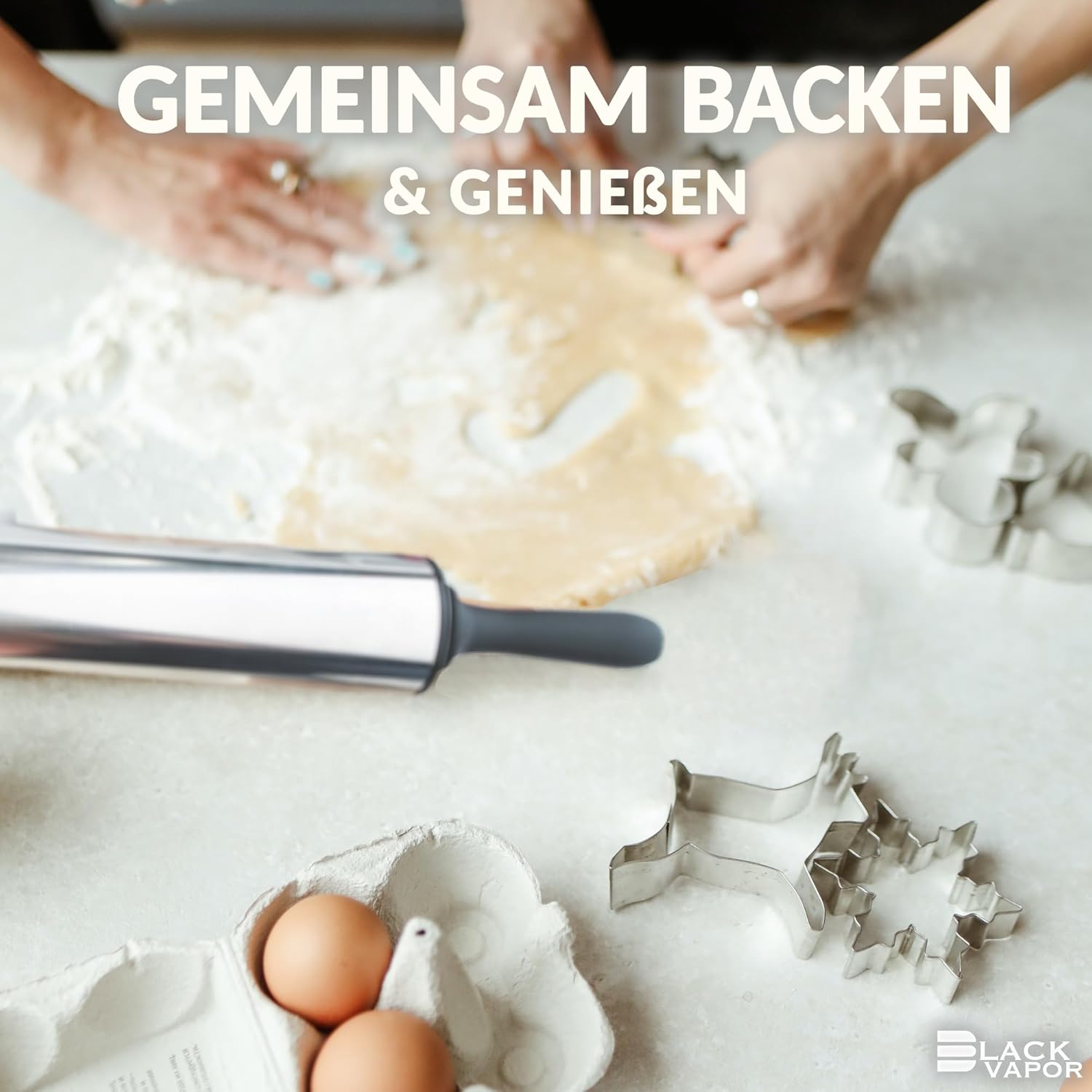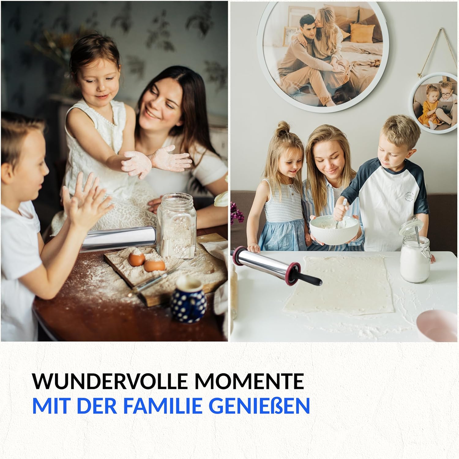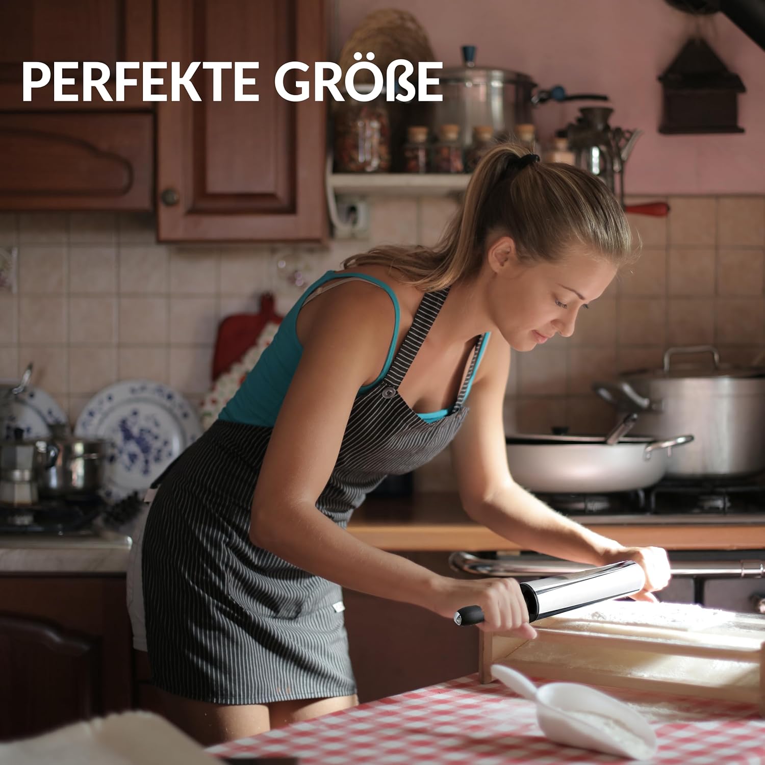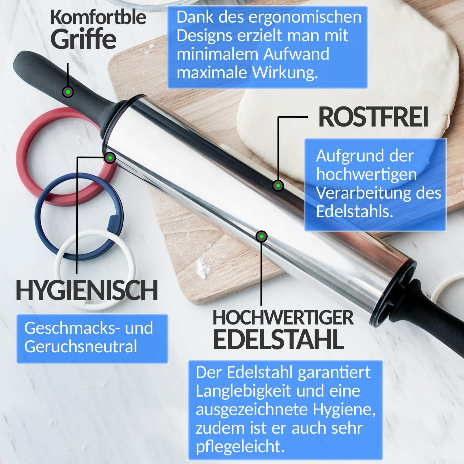 - ✅ MATERIAL UND GRÖSSE: Der Rollstab ist ca. 48 cm lang (pro Griff 8,5 cm) und besteht zu 100% aus hochwertigem Edelstahl 18/10 mit geprüfter Lebensmittelqualität.