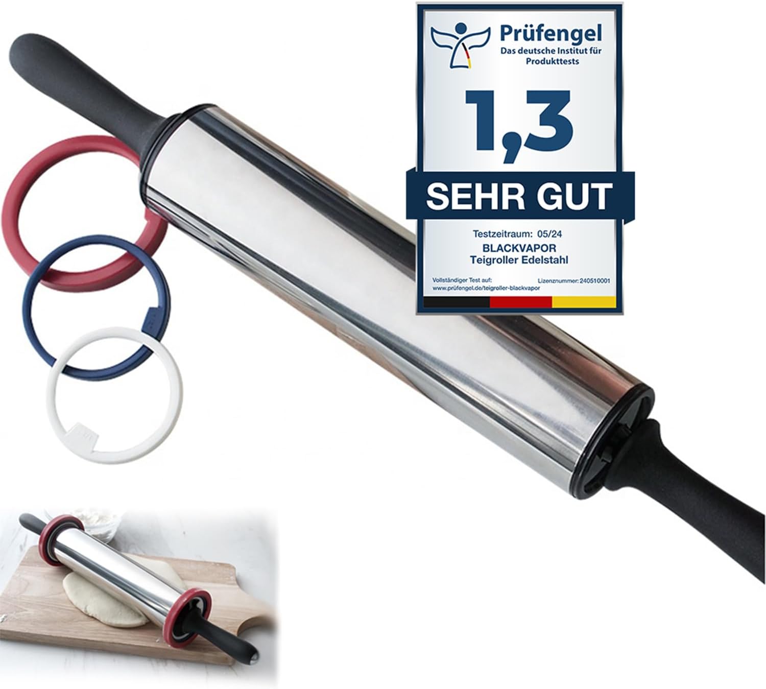 - ✅ LIEFERUMFANG: 1x Nudelholz klein ca. 48 cm lang (8,5 cm Griff) aus Edelstahl mit 6 Abstandshalter / Distanzscheiben in 3 verschiedenen Grössen, erleichtert das Ausrollen vom Teig auf die passende Dicke