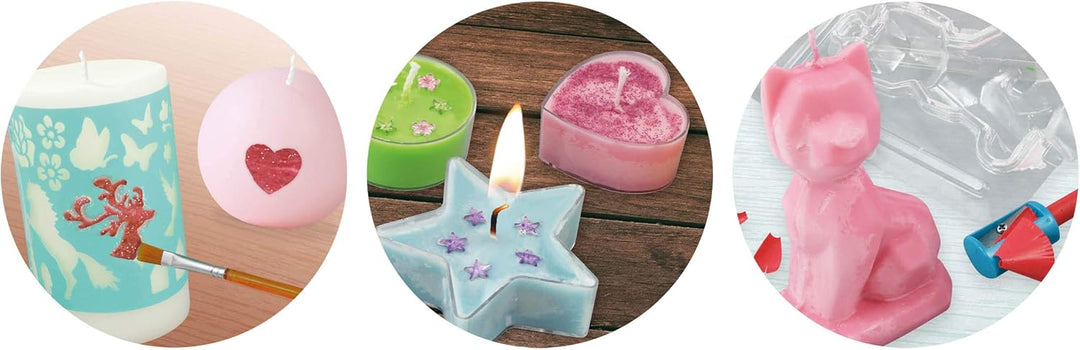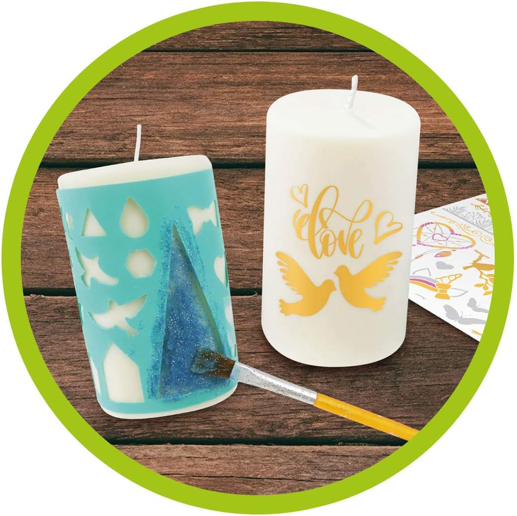 - Gebe deine Kerzen eine persönliche Note dank des inklusives Zubehör: Wachsmalstifte, Pailletten, Schablone, Pinsel…