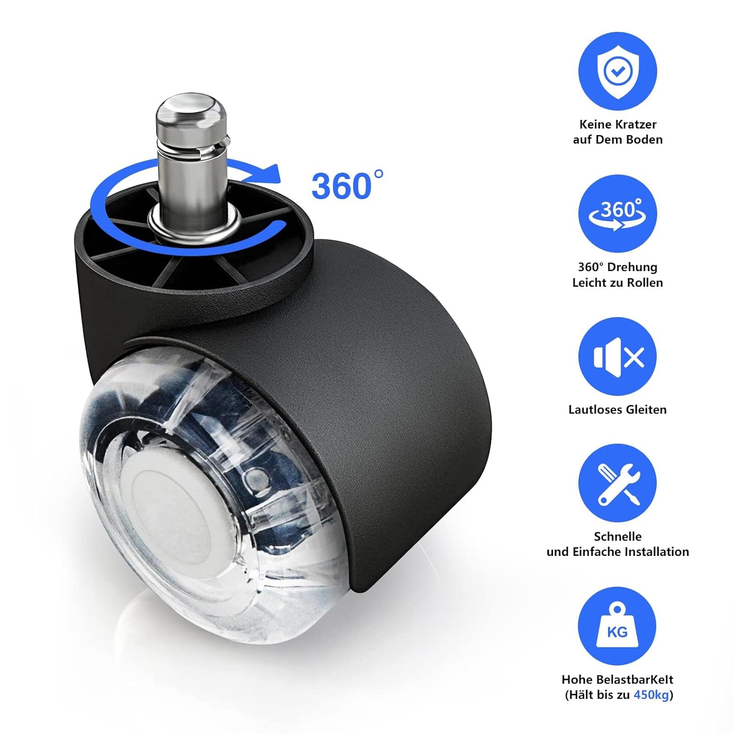 - 【Werkzeugfreie & Einfache Installation】Für die Montage der Stuhlrollen ist kein Werkzeug erforderlich. Entfernen Sie einfach das alte Stuhlrad und richten Sie den neuen Ersatzradstift mit dem Loch aus und drücken Sie ihn ein. Die Montage und