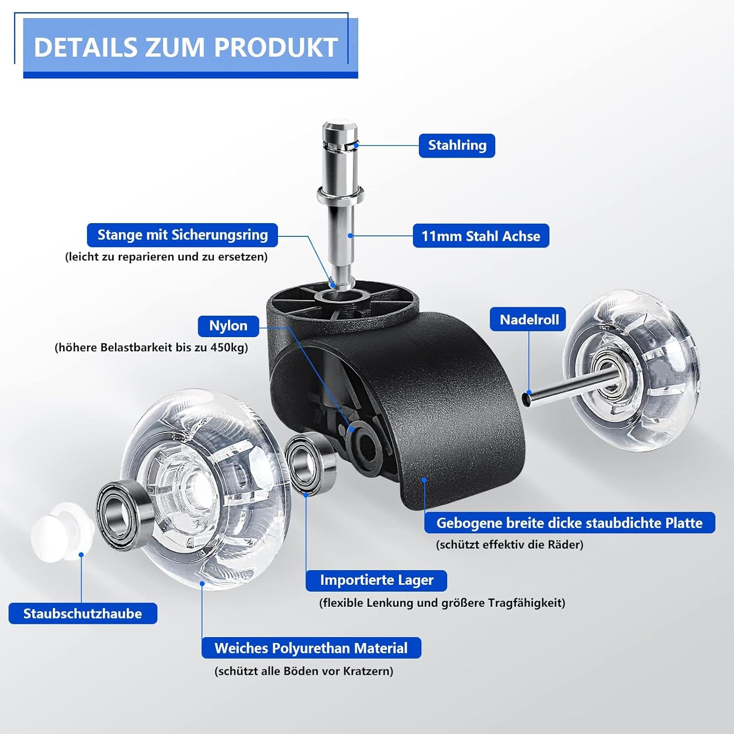 - 【Leises & Sanftes Gleiten】Zweireihige Räder + vier Hochpräzisionslager + eine Radschale aus weichem Polyurethan. Hochpräzisions kugellager am Laufrad und an der Rollenwelle sorgen für eine gleichmässige und leise Abrollbewegung ohne Geräusche.