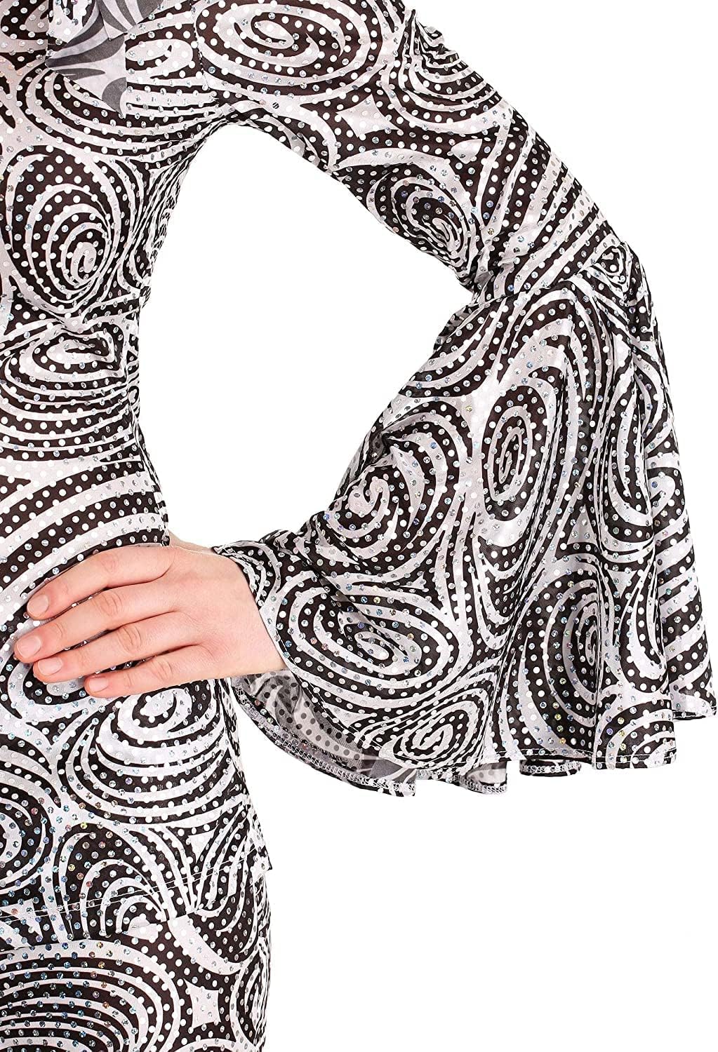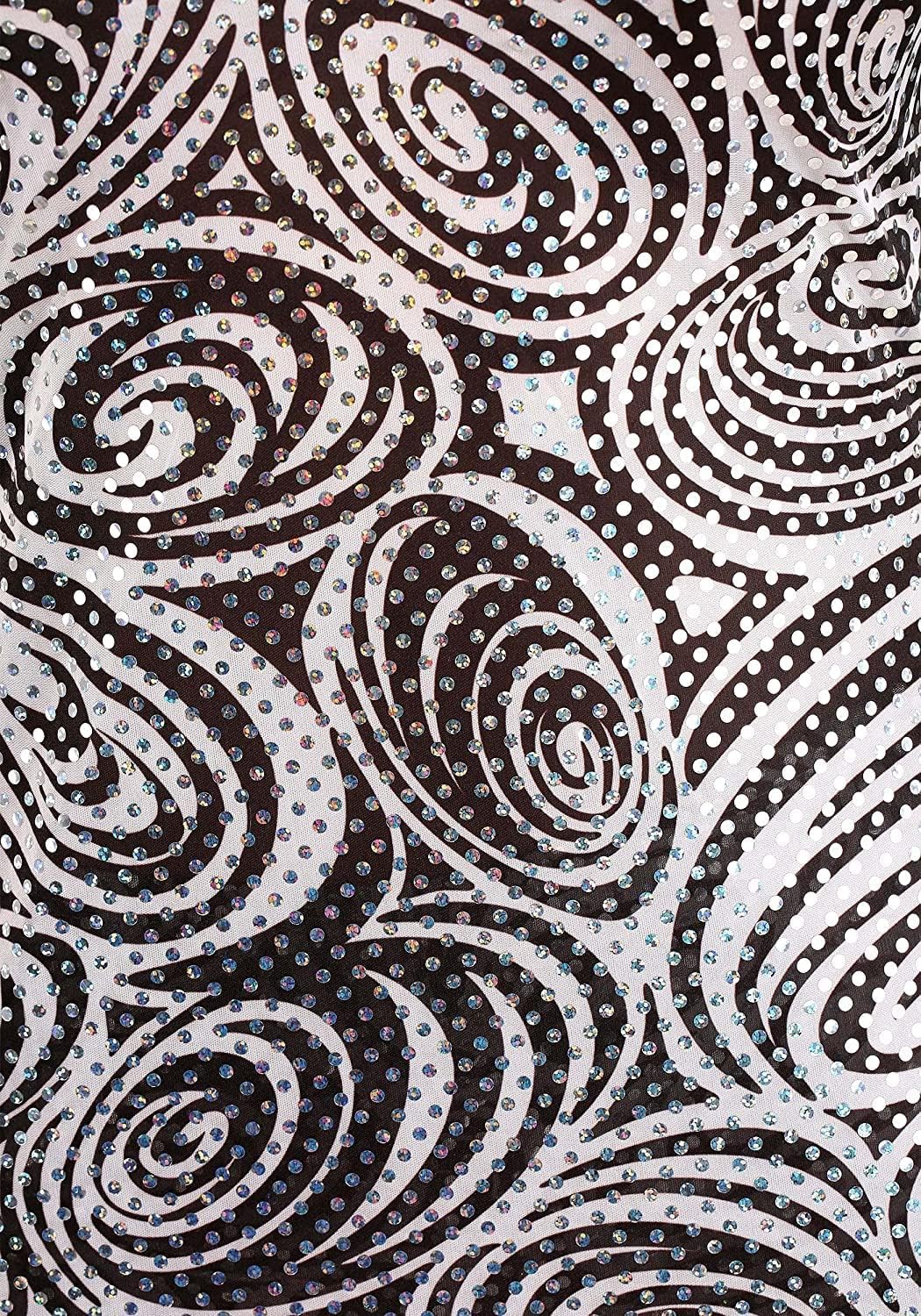 - 100 % Polyester-Interlock-Strick mit schwarz-weissem Wirbeldruck mit schillernden Pailletten. Pullover-Top hat V-Ausschnitt und breite Glockenärmel unter den Ellbogen. Hose hat eine elastische Taille, breite Schlitzausgestellte vom Knie bis zum Knöchel