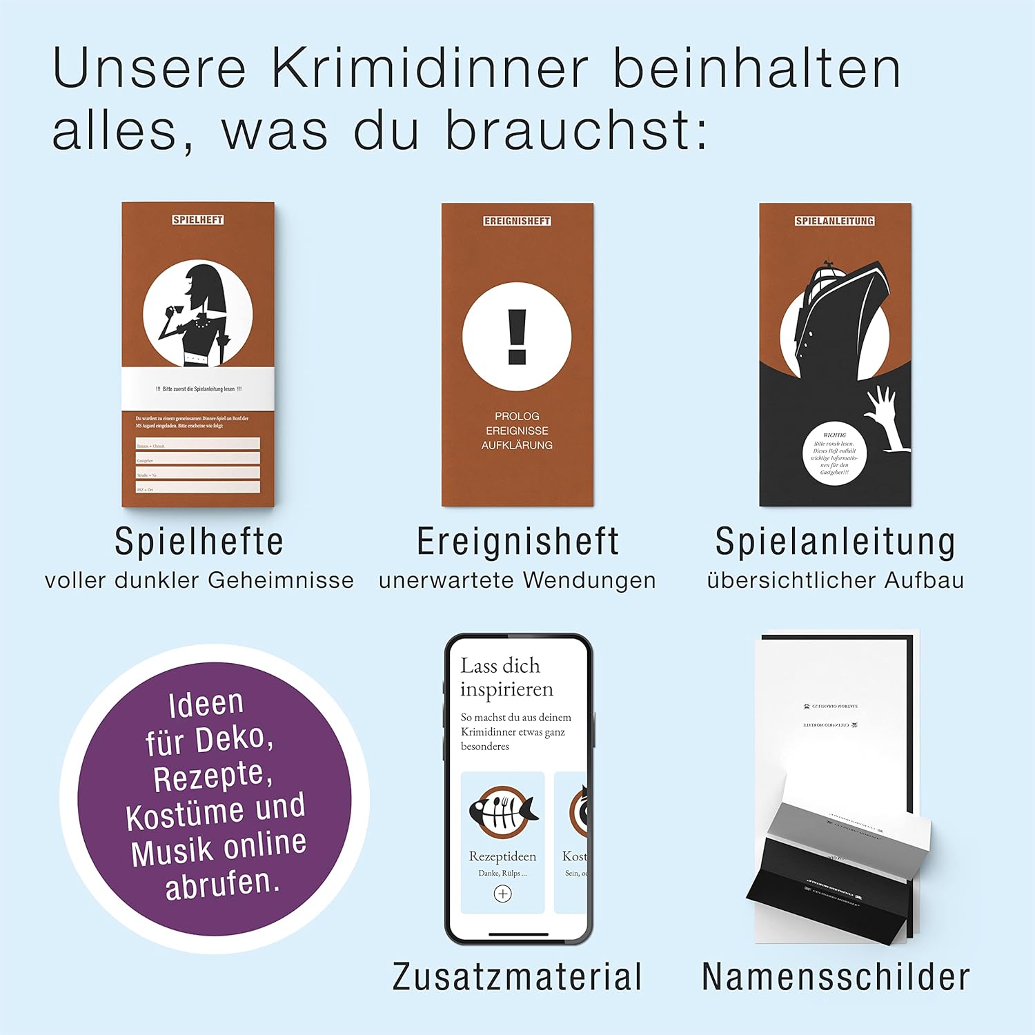 - DETAILS – Das „Finde den Mörder Spiel“ wird in einer Box mit allen Materialien geliefert. Jeder Crime Dinner Gast bekommt eigene Informationen zu seiner Rolle & geheime Hinweise. Spielanleitung, Namensschilder & Supportcode liegen ebenfalls bei.