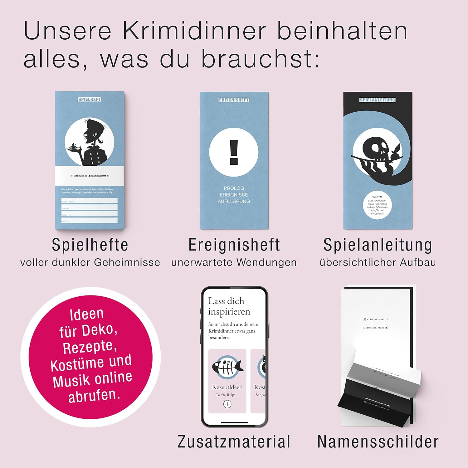 - DETAILS – Das „Finde den Mörder Spiel“ wird in einer Box mit allen Materialien geliefert. Jeder Crime Dinner Gast bekommt eigene Informationen zu seiner Rolle & geheime Hinweise. Spielanleitung, Namensschilder & Supportcode liegen ebenfalls bei.