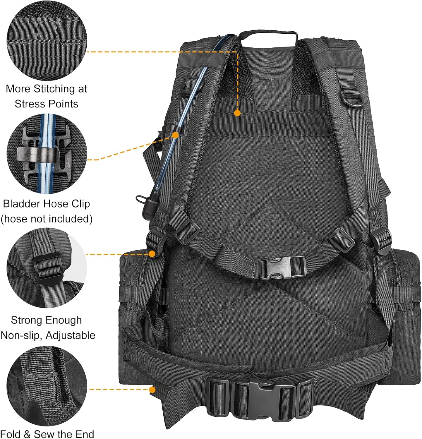 - 50–60 l extra grosses Fassungsvermögen, reichlich Platz für Laptop, Survival- und Wanderausrüstung und viele separate Fächer, um deine wichtigen Dinge zu organisieren. Das Molle-System dieses militärischen Molle-Rucksacks ermöglicht es dir,