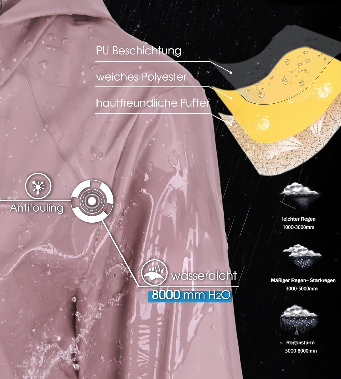 - 【Regenjacke Material】100% PU beschichtete Regenmantel sind besonders wasserabweisend. Der wichtigste Vorteil ist die dauerhafte Dichtheit, die es den Geweben verleiht. Im Gegensatz zu einer herkömmlichen Imprägnierung oder einer DWR ist eine