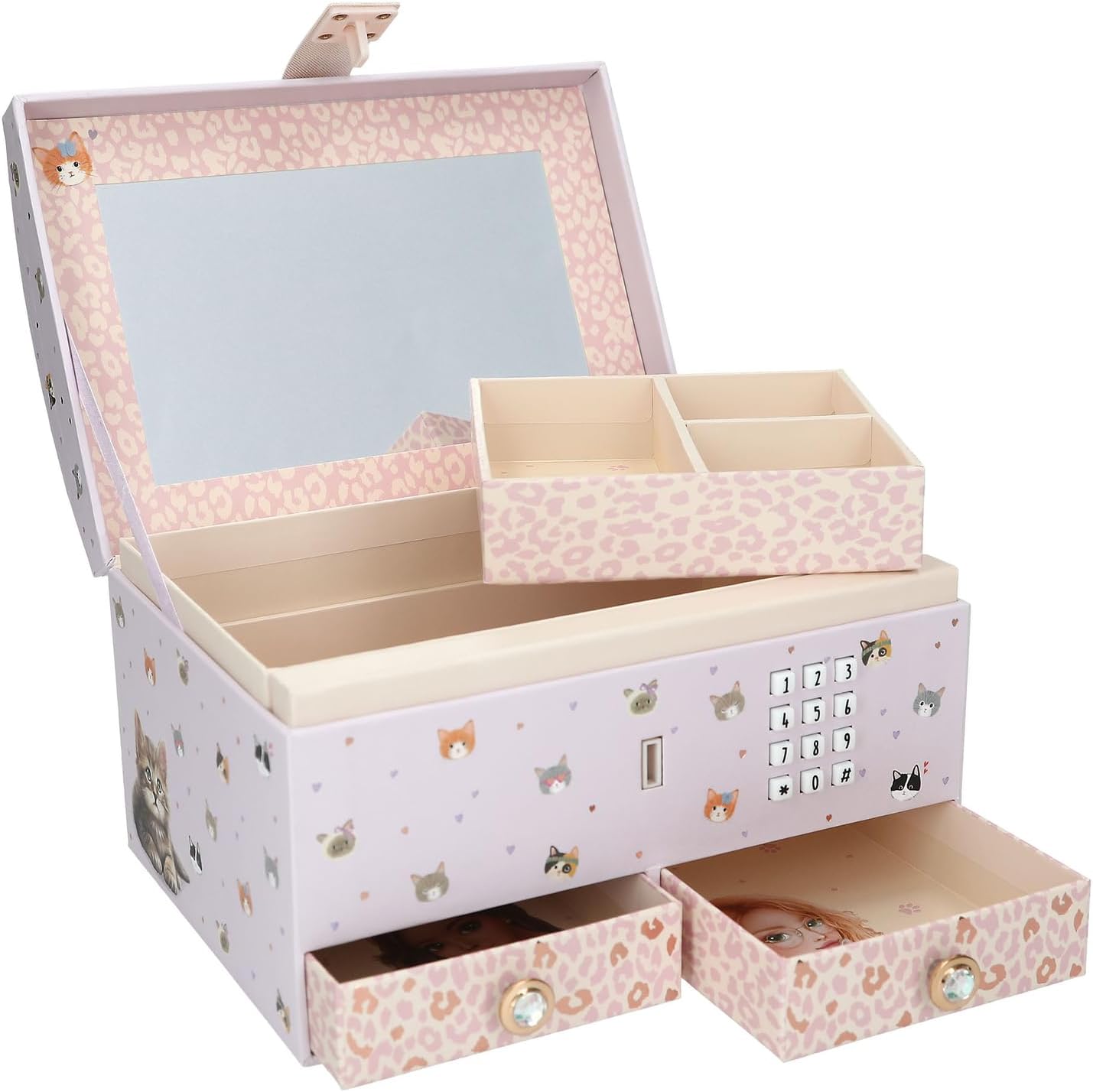 - Ausgestattet mit einem Klappdeckel, Spiegel, 2 kleinen Schubladen, ein herausnehmbares Inlay und ein weiteres Fach darunter für genügend Platz, um Ringe, Ketten und andere Schmuckstücke zu ordnen
