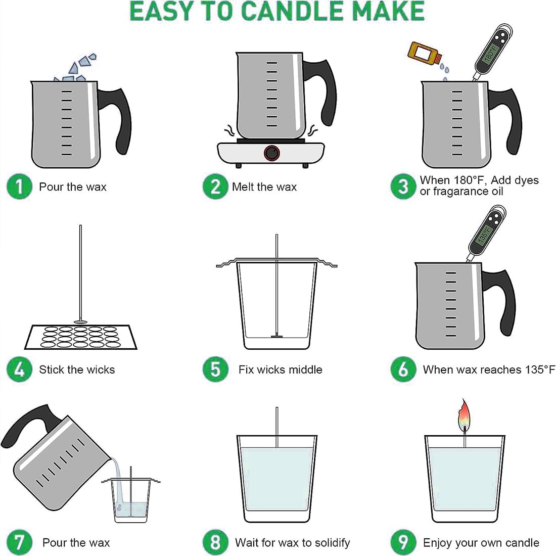 - CANDLE MAKING KIT: 900ml 304 Edelstahl Kerzengiesstopf ×1, hitzebeständige Silikonmatte ×1, 17.7oz/500g Sojawachs ×1, 13cm Kerzendochte ×50, Dochtaufkleber ×60, Edelstahl-Dochthalter ×2, Thermometer ×1, Löffel ×1. Dieses DIY