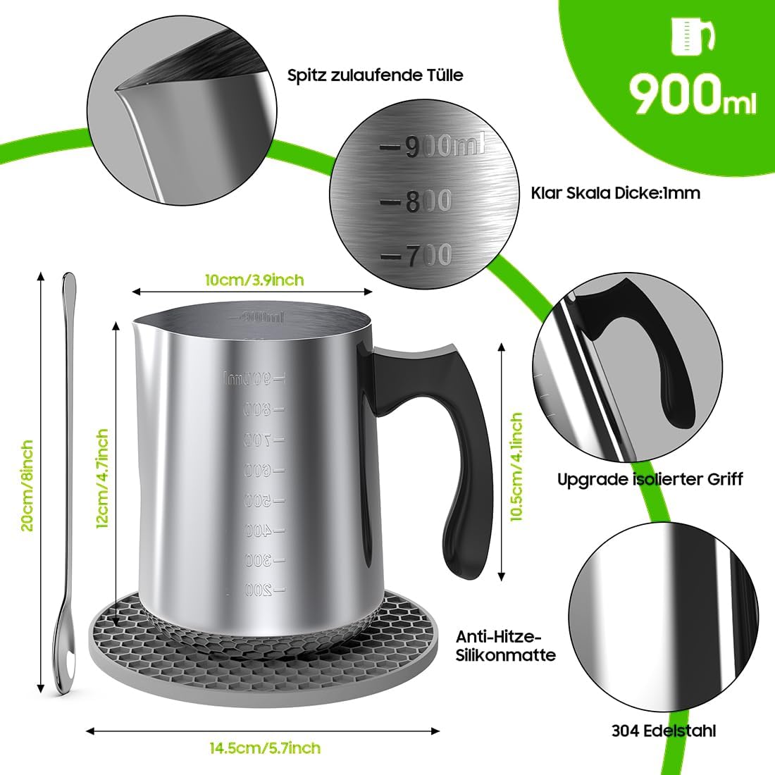 - GROssVOLUMIGER GIESSBECHER (900ml): Hergestellt aus robustem 304 Edelstahl, widersteht dieser rostfreie Topf hohen Temperaturen und Korrosion. Integrierte Innen- und Aussenmessskalen ermöglichen präzise Wachsmengenkontrolle. Lebensmittelecht - ideal