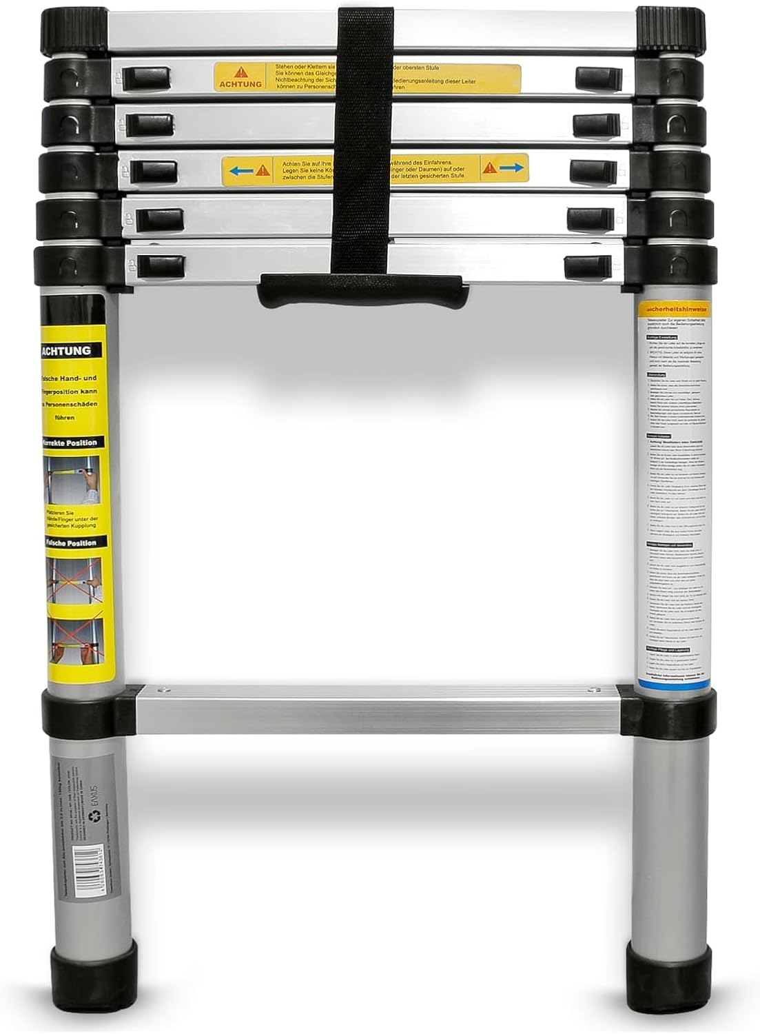 - Verlassen Sie sich mit unserer Eaxus Aluminiumleiter auf ein hohes Mass an Sicherheit. Unsere Teleskopleiter ist nach der Sicherheitsnorm DIN EN131 geprüft & besitzt eine Tragfähigkeit bis zu 150kg