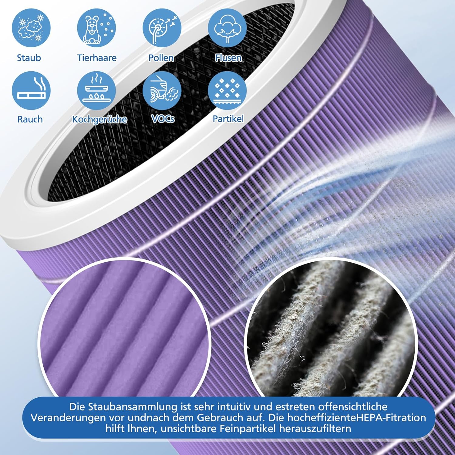 - 【3-Schicht-Stufenfiltration】Die äusserste Schicht hilft dabei, Haare, Flusen und andere grosse Partikel zu filtern. Die zweite Schicht des HEPA-Filters absorbiert Partikel mit einer Grösse von bis zu 0,1 Mikrometern. Die dritte Schicht aus