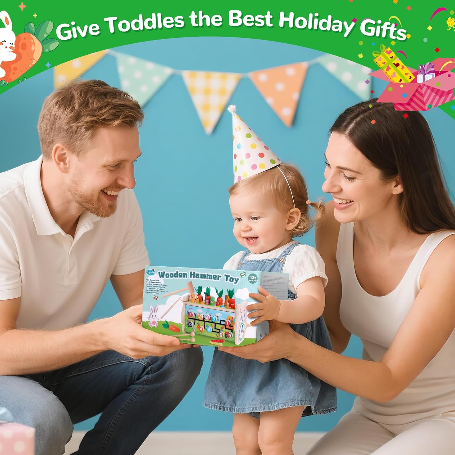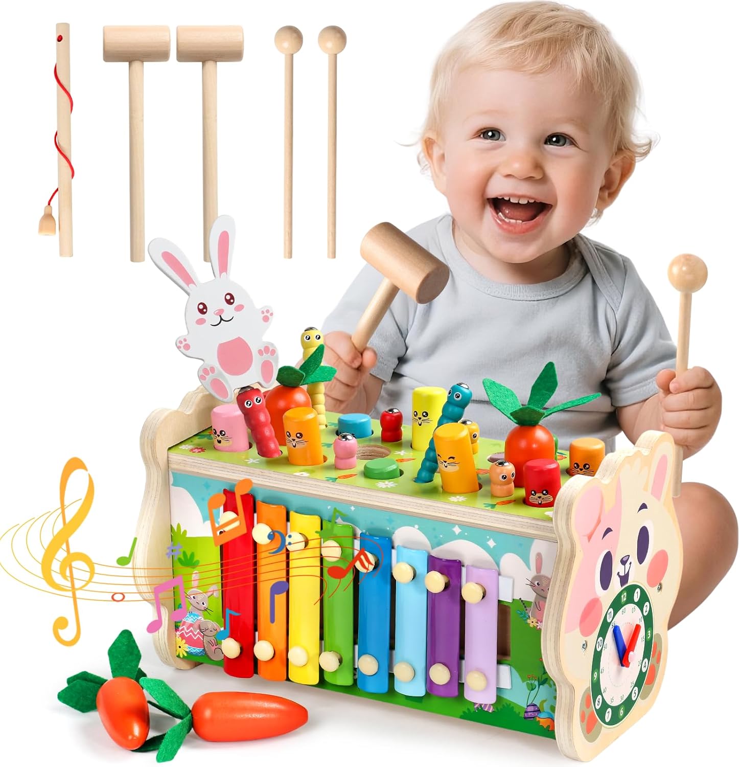 - 【7-in-1 Montessori Spielzeug】Dieses motorikspielzeug ab 1 jahr umfasst 7 spiele: Hammerspiel, Xylophon Kinder, Karottenziehen, Käferfangen, Zahlenlabyrinth, Uhr und Zahnräder. Viel spass, viel spass - Kinderspielzeug ab 1 jahr