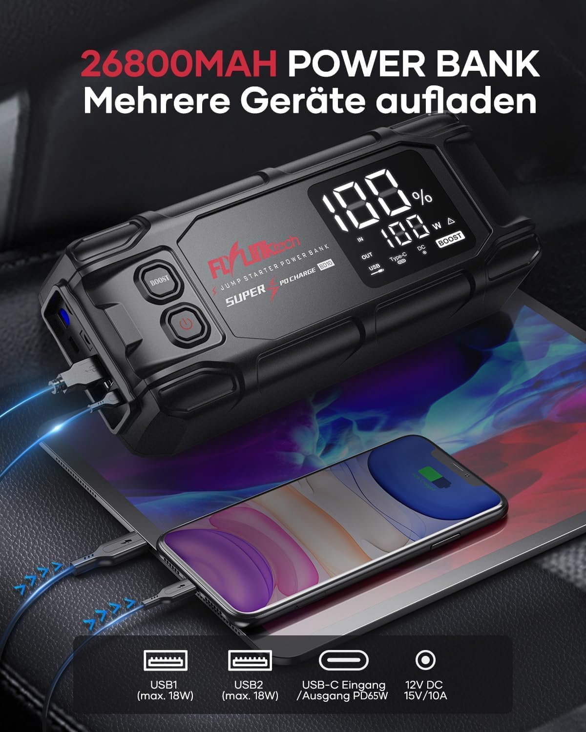 - ποΈγππ±π©/ππ¬π ππ ππ¨π¦πππ‘πγ: Neben dem bidirektionalen Schnellladen ΓΌber PD65W USB-C und dem maximalen 18W USB-A-Ausgang kann die 26800mAh tragbare Starthilfe-Powerbank auch einen DC-Ausgang (15V/10A,
