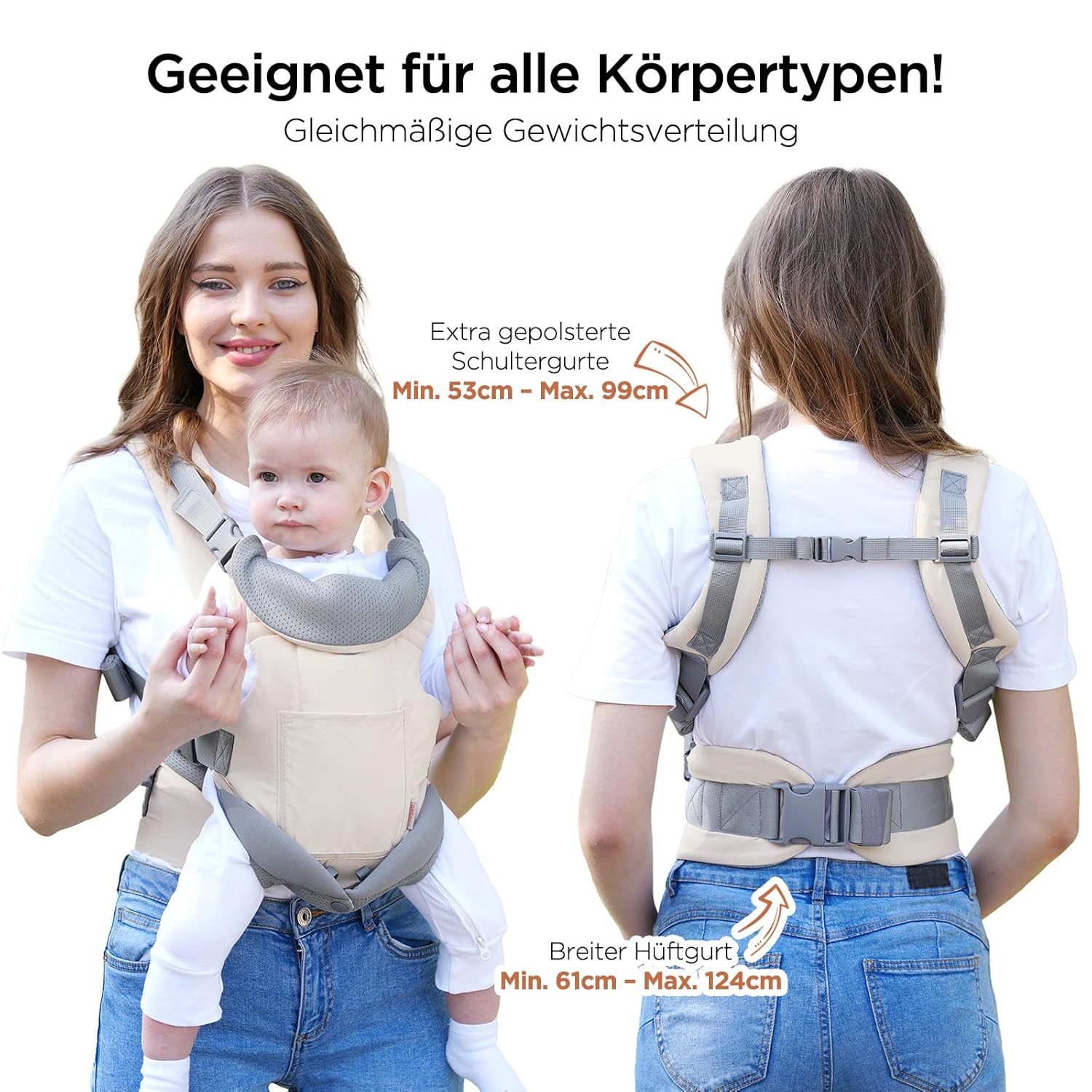 - Verstellbarkeit: Verstellbare Breite der Hüften des Babys für verschiedene Positionen, gepolsterte Schultergurte und unterstützender Hüftgurt, entworfen, um eine Vielzahl von Körpertypen und Lebensstil zu passen.