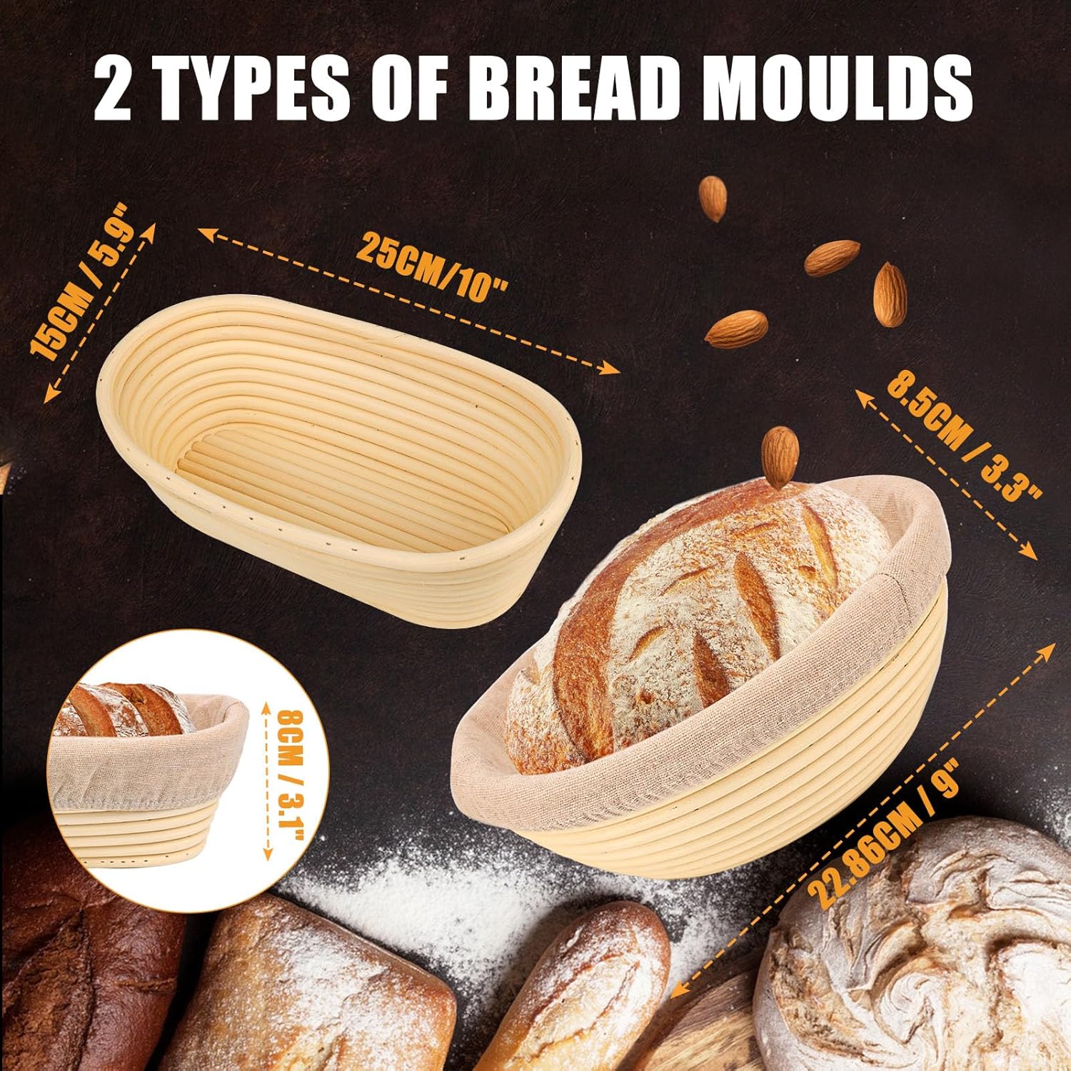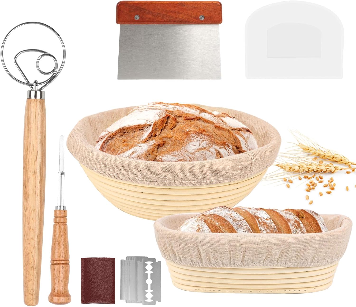 - Professionelle Werkzeuge für die Brotherstellung: Dieses Gärkorb Set ist ein unverzichtbares Werkzeug für jeden Brotliebhaber. Es enthält runde und ovale Backkörbe, 2 Staubtücher, 1 Brotschlitten mit 5 Klingen, 2 Teigschneider und einen Mixer mit