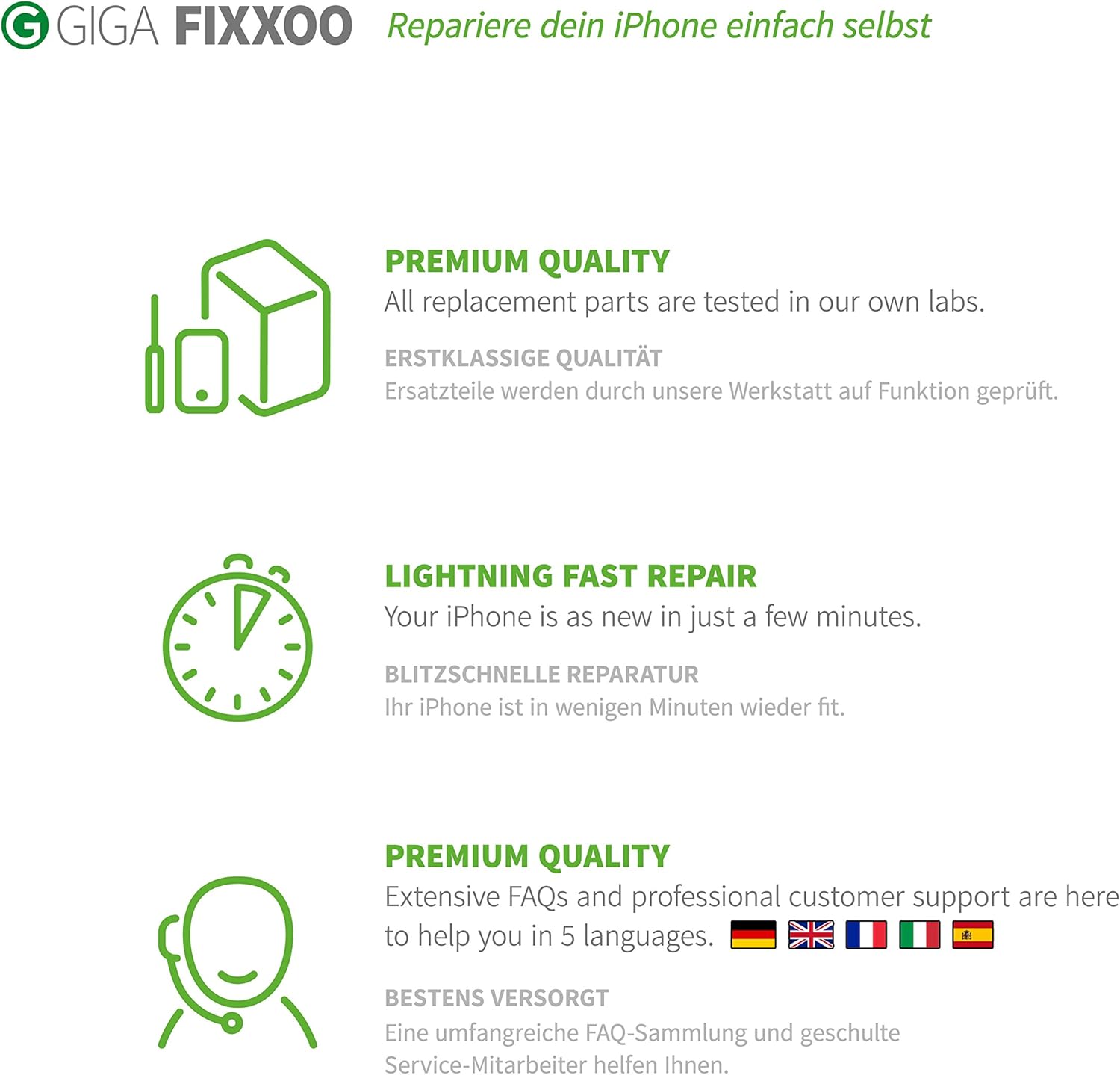 - ✅ GIGA FIXXOO ZUFRIEDENHEITSVERSPRECHEN - Ihre Zufriedenheit ist für uns das Wichtigste! Sollte es im unwahrscheinlichen Fall vorkommen, dass Sie mit Ihrem neuen iPhone Displayersatz nicht zufrieden sind, können Sie uns jederzeit eine Nachricht