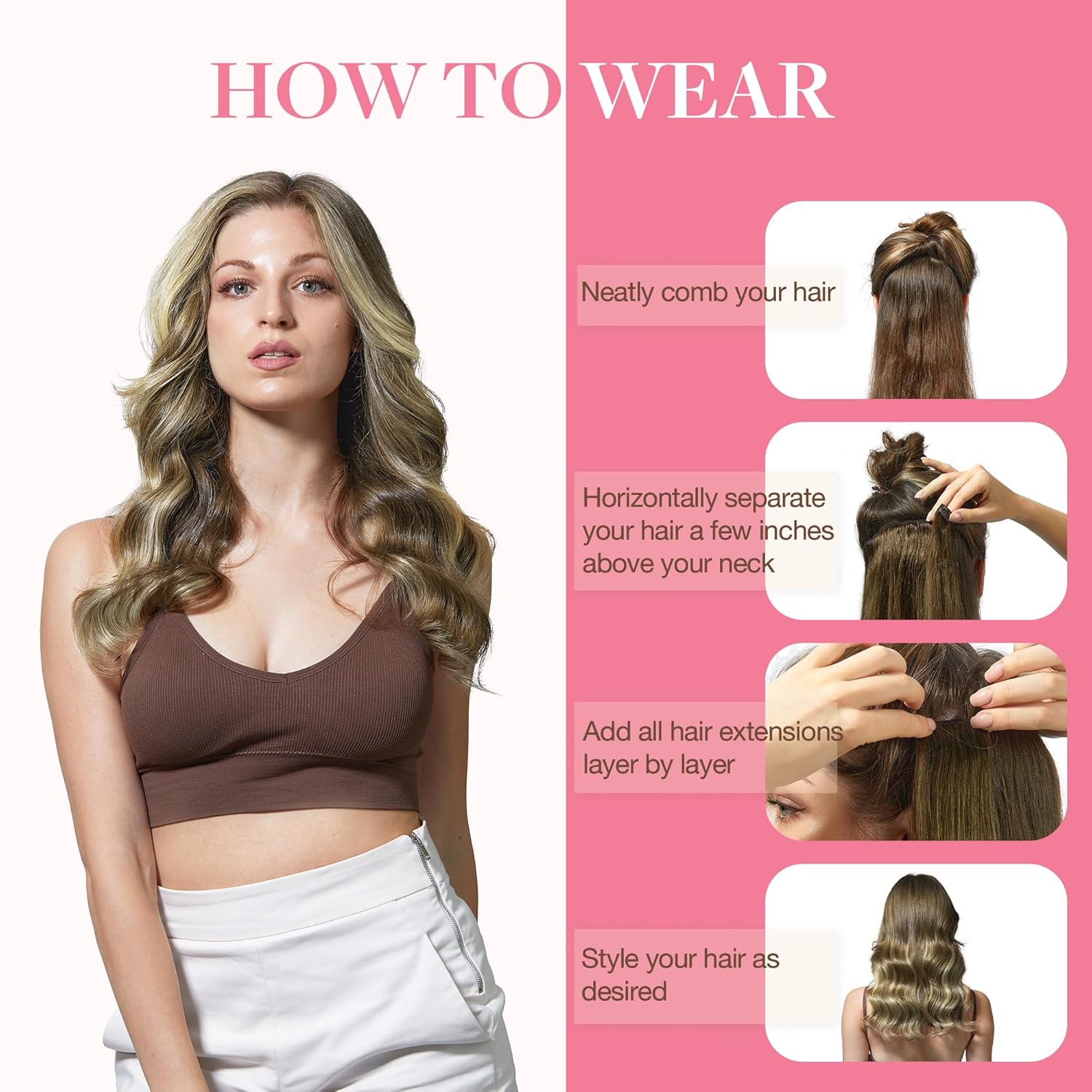 - Hochwertige Clips, schnell zu tragen: Schlanke, silikongestützte Clips mit PU-Design machen unsere Erweiterungen unsichtbar, bequem und leicht. Sicher genäht und gepolstert schützen sie Kopfhaut und Haar. Einfach anzuwenden, perfekt für jeden Anlass