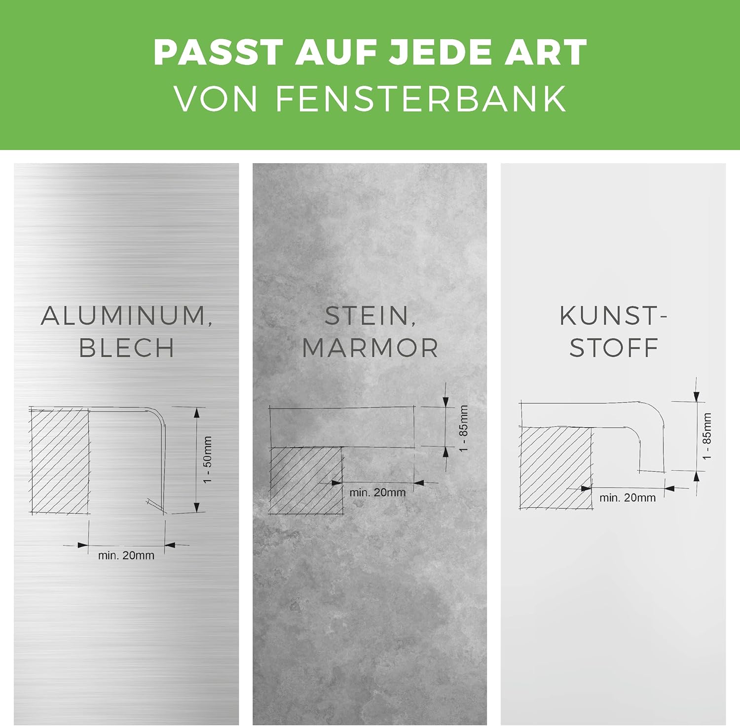 - passt auf alle gängigen Fensterbänke wie Aluminium, Blech, Kunststoff, Marmor, etc. Bei Aluminium- oder Blechfensterbänke mit einer Regennase über 25 mm benötigen Sie den masu-Abstandhalter, damit der Steher fest und stabil auf der Fensterbank
