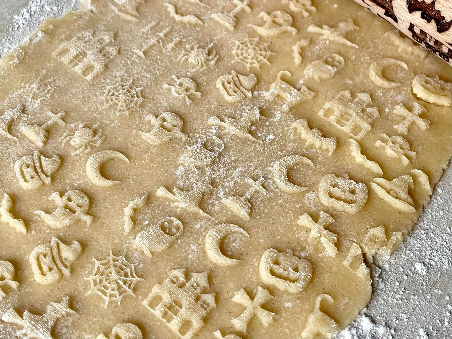 - Rollen Sie den Teig zuerst mit einem klassischen Nudelholz aus, anschliessend prägen Sie das Muster mit dem Prägenudelholz und stanzen oder schneiden dann die Kekse aus.