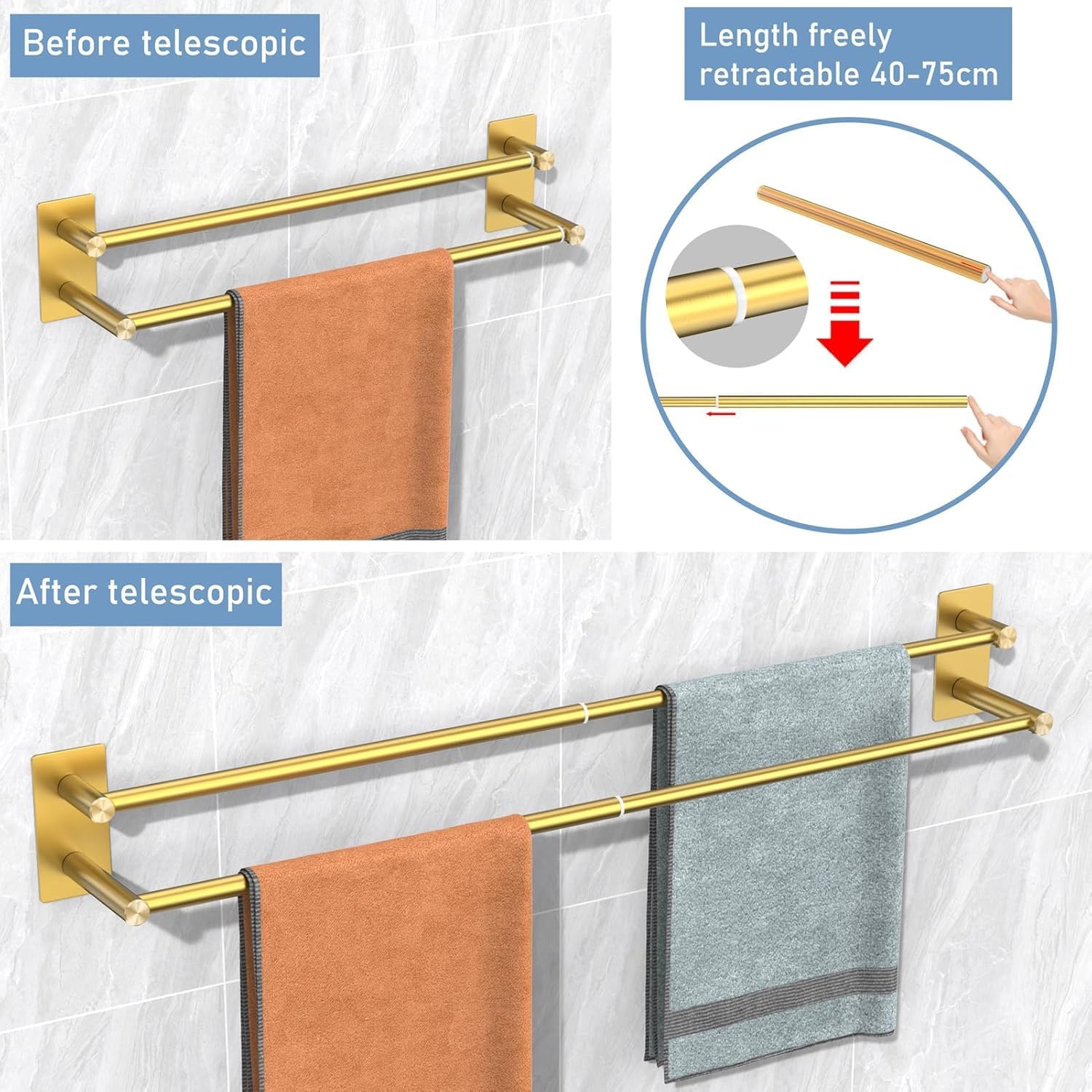 - 【Grösse】Der Handtuchhalter hat eine Teleskopreichweite von 40-75cm und kann frei eingestellt werden. Das doppelschichtiges Design kann mehr Handtücher oder Badetücher aufhängen.