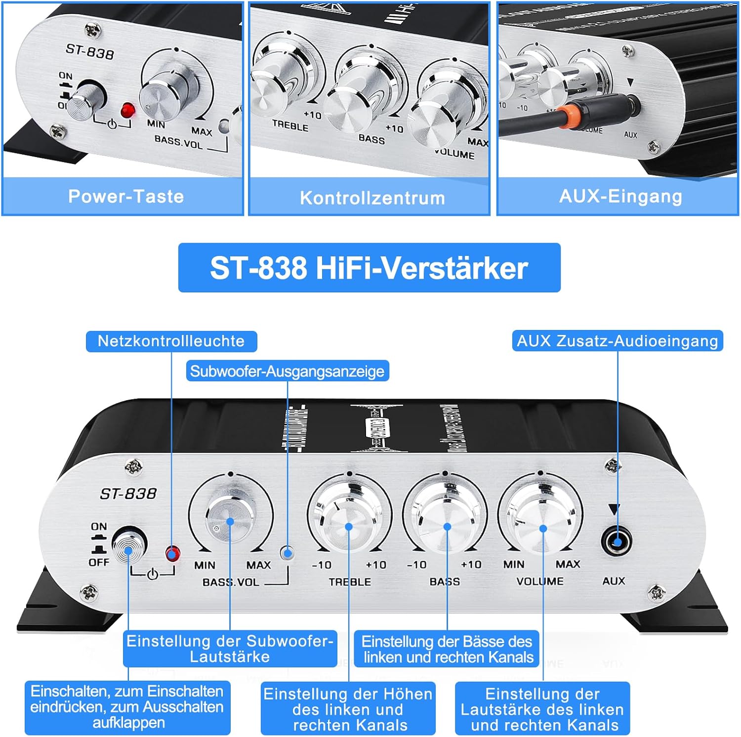 - Subwoofer Audio-Verstärker: ST-838 ist ein HiFi-Audio-Verstärker, mit Subwoofer, Höhen-und Bassregler Tasten, AUX-Eingang und Lautstärkeregler-Taste, Was ist mehr, ST-838 ist ein Subwoofer-Verstärker für Ihre mehr Bass-Effekt von spezialisierten