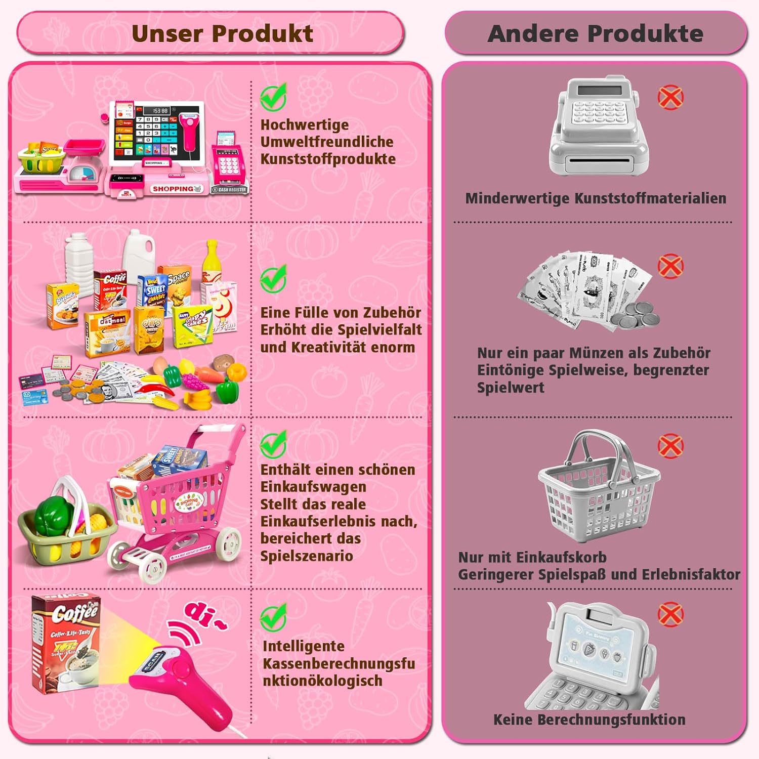 - 【Multifunktionale Elektronische Kasse】 Dieses kasse spielzeug verfügt über einen Scanner mit rotem Licht und Sound, der ein realistisches Einkaufserlebnis schafft. Kinder können damit Rollenspiele spielen, was ihre Fantasie anregt und Langeweile
